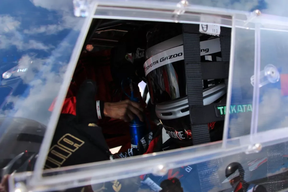 A pak to přijde! Najednou uvnitř boxů Toyoty začne šrumec. Zjeví se sám pan nejvyšší. Je to on! V černé kombinéze, kterou se odlišuje od zbývajících týmových kolegů v bílých kombinézách, přichází do garáže, obklopený haldou fotografů.
