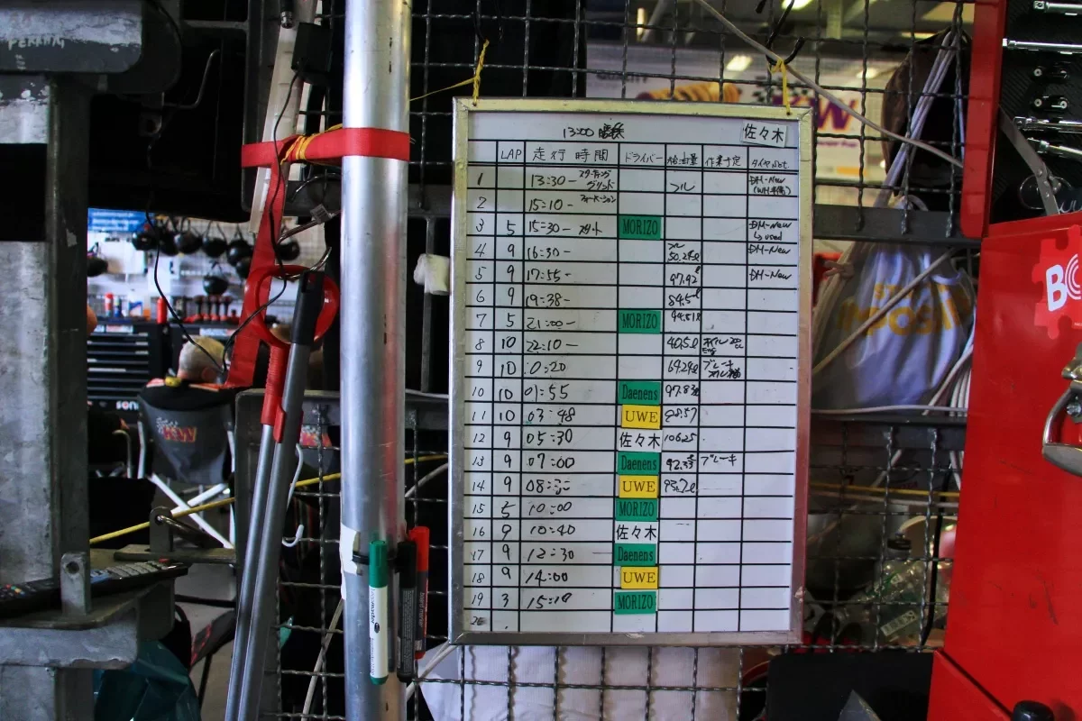 Mezitím jsem uvnitř garáže Toyoty odhalil rozpis jednotlivých stintů, na kterém byla uvedena i jména závodníků, kteří pojednou, hezky popořadě i s předpokládaným časem zastávky v boxech. Morizo, což je přezdívka, pod kterou Akio Toyoda dlouhodobě vystupuje, tu naštěstí napsaný je.