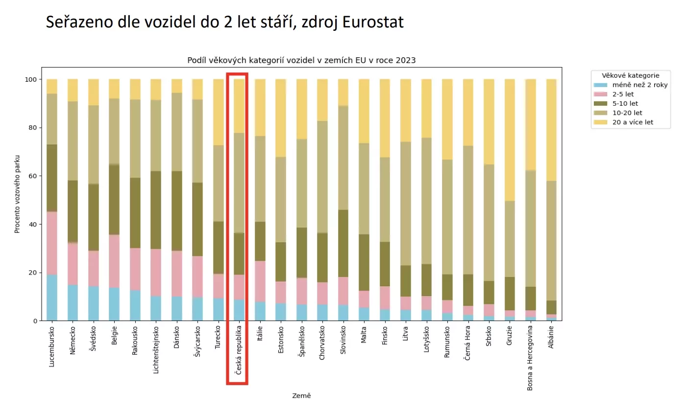 Podle průměrného stáří České republice dle stejného zdroje náleží 28. místo z 29 evropských zemích. Starší vozidla než v ČR už mají jen v Řecku, kde jejich průměrné stáří dosahuje 17,3 roku. Například v Německu dosahuje vozový park průměrného stáří jen rovných 10 let. Podle dat Eurostatu z roku 2023 se v rámci EU nacházíme na 10. pozici, co se týče podílu aut do 2 let stáří. V případě vozidel do 10 let stáří klesáme na 14. pozici a dostává se před nás Slovinsko, Itálie, Španělsko a Chorvatsko.