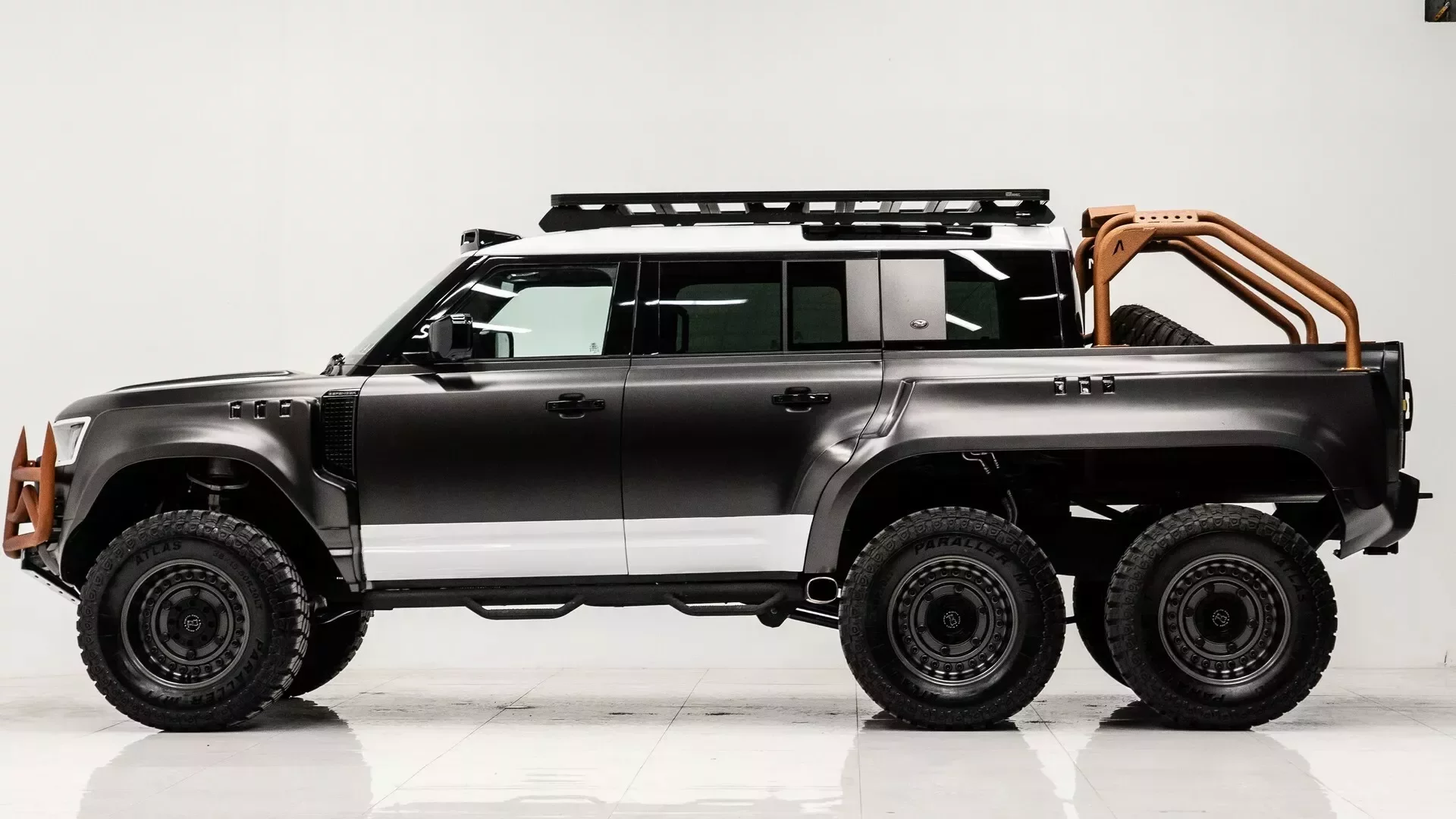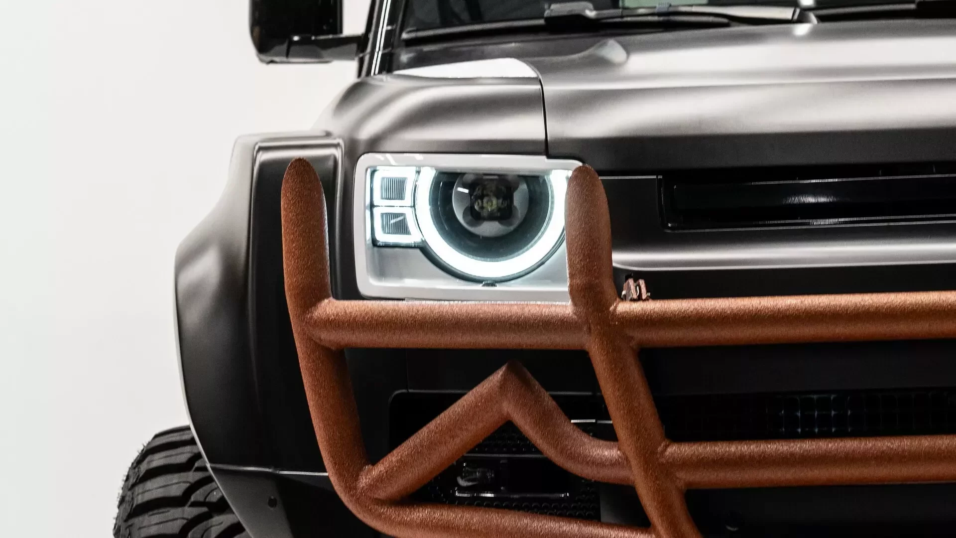 I karoserie Defenderu se dočkala řady úprav, včetně rozšířených blatníků, ochranných plechů, postranních stupátek a ochranných lišt. Na čumáku najdeme výrazný oranžový ochranný rám, zatímco střechu zdobí LED reflektory a střešní nosič. Zadní část nese sportovní lišty a plnohodnotné rezervní kolo.