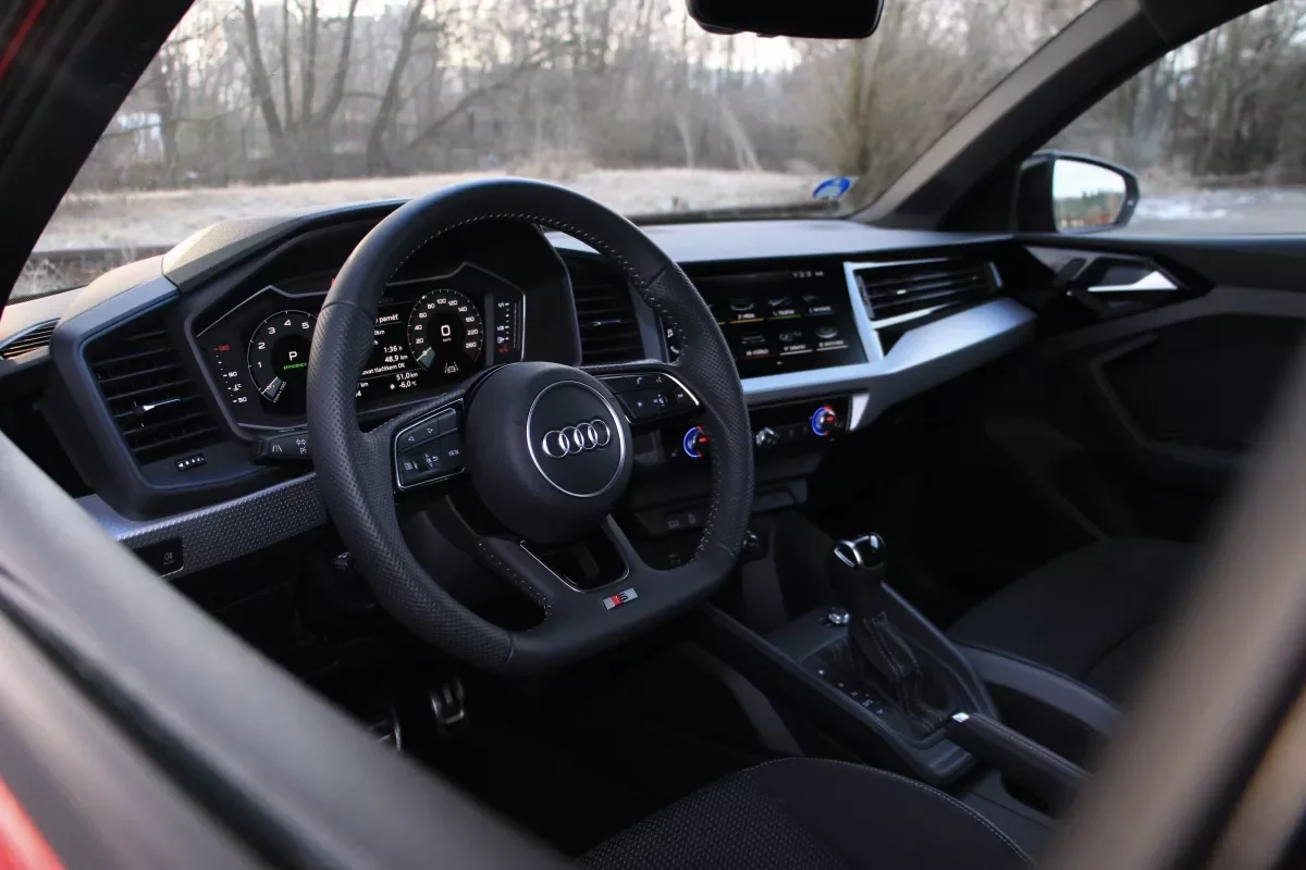 Interiér A1 je tradičně pěkně smontovaný a na posádku dýchne aura prémiové značky. Displej místo budíků vypadá efektně, stejně tak krásný displej multimédií, minimalisticky pojatý design a na řidiče orientovaná palubní deska. Sedačky mají výborné boční vedení a nabízejí perfektní sportovní pozici za volantem. Perfektní je aerodynamické odhlučnění kabiny, ovšem nevyvážené tříválcové drnčení přesto místy prostoupí dovnitř, hlavně ve chvíli, kdy je motor podtočený. Není to prostě důstojné.