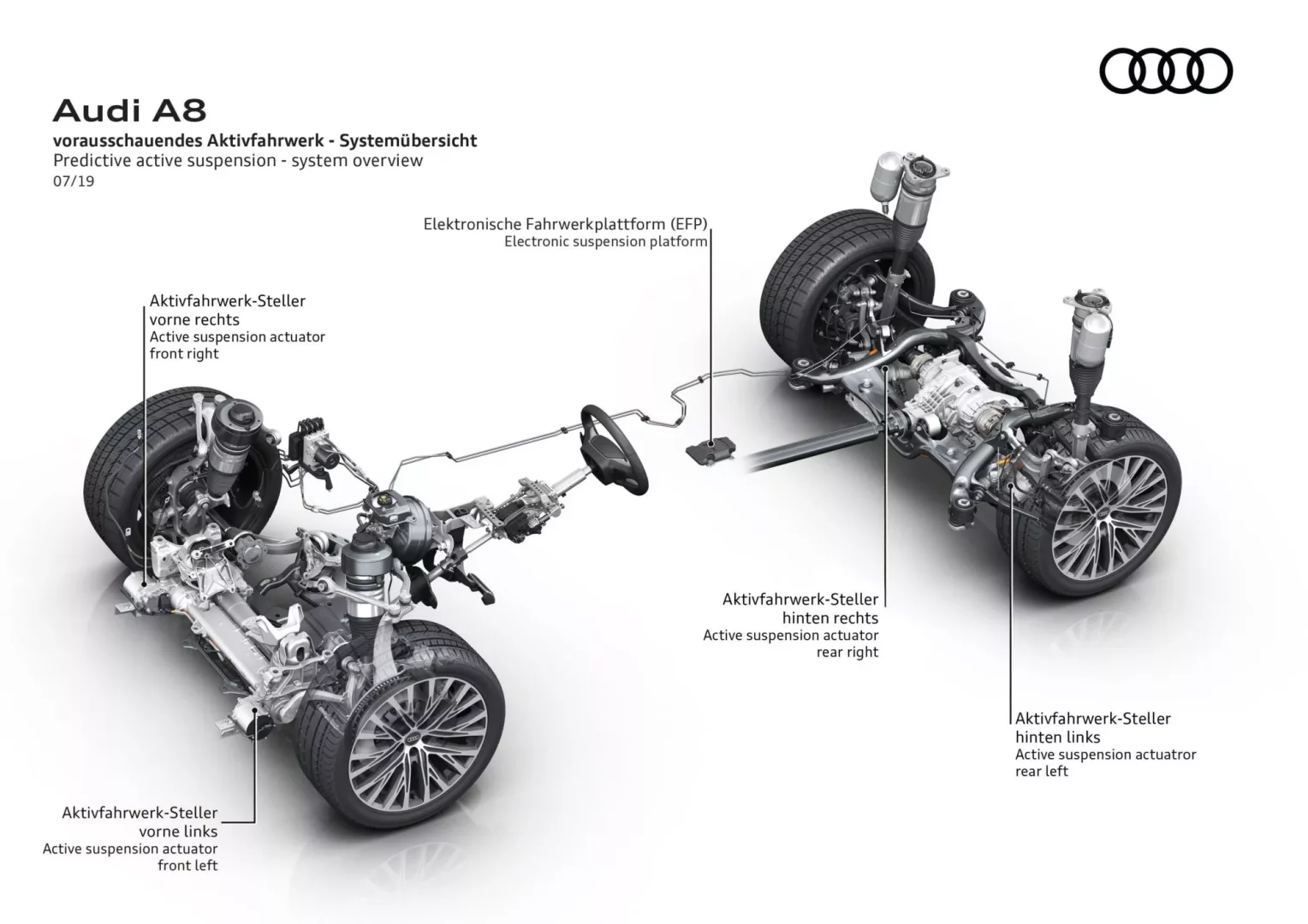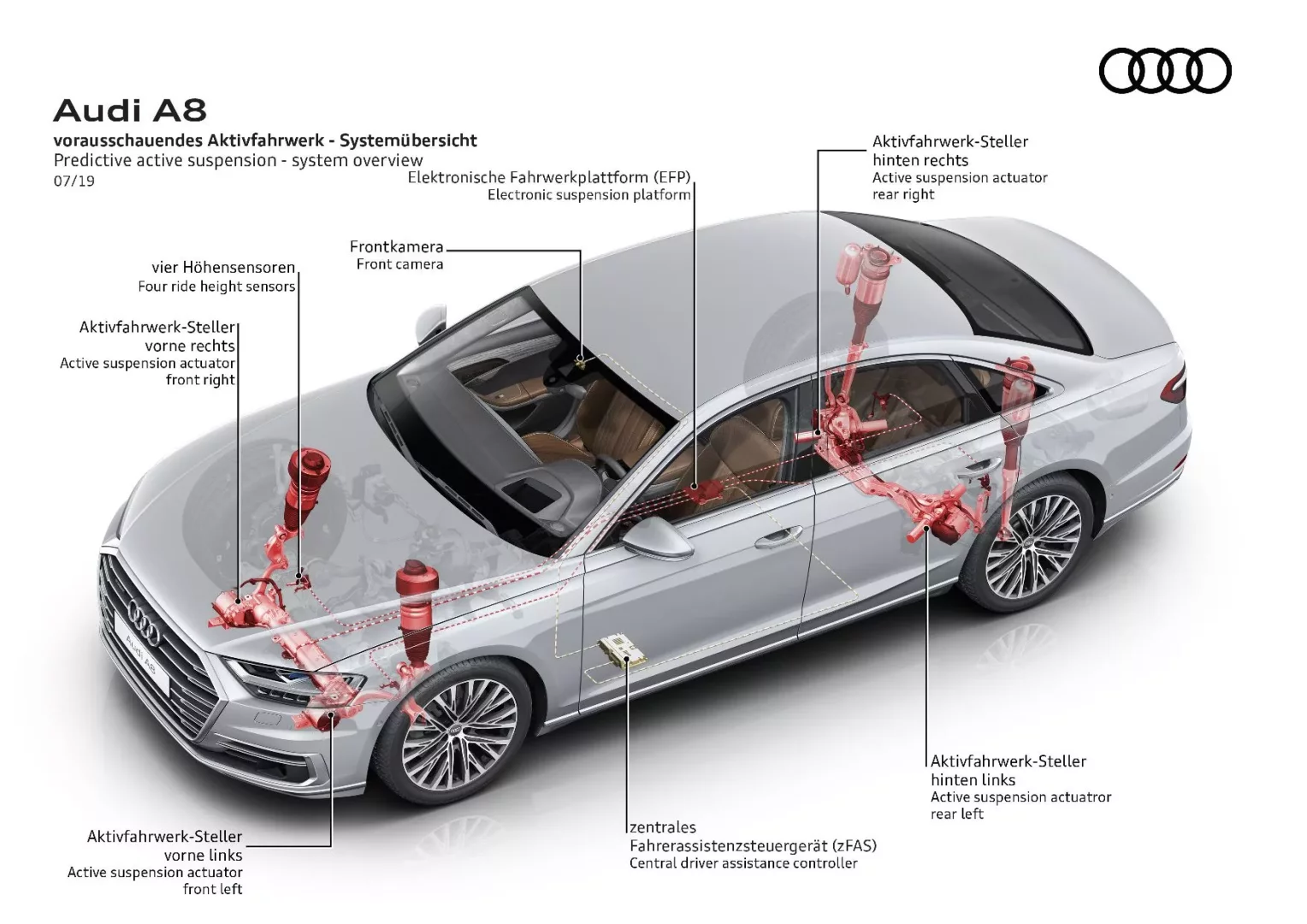 Prediktivní aktivní podvozek modelu Audi A8 je zcela aktivním systémem odpružení. Elektromechanické ovládací prvky dokážou každé kolo luxusní limuzíny zdvihnout vzhůru nebo stlačit dolů, a tím aktivně regulovat polohu karoserie v každé jízdní situaci. Aktivní podvozek může během pěti desetin sekundy zvýšit nebo snížit karoserii u všech čtyř kol ze střední polohy až o 85 milimetrů.