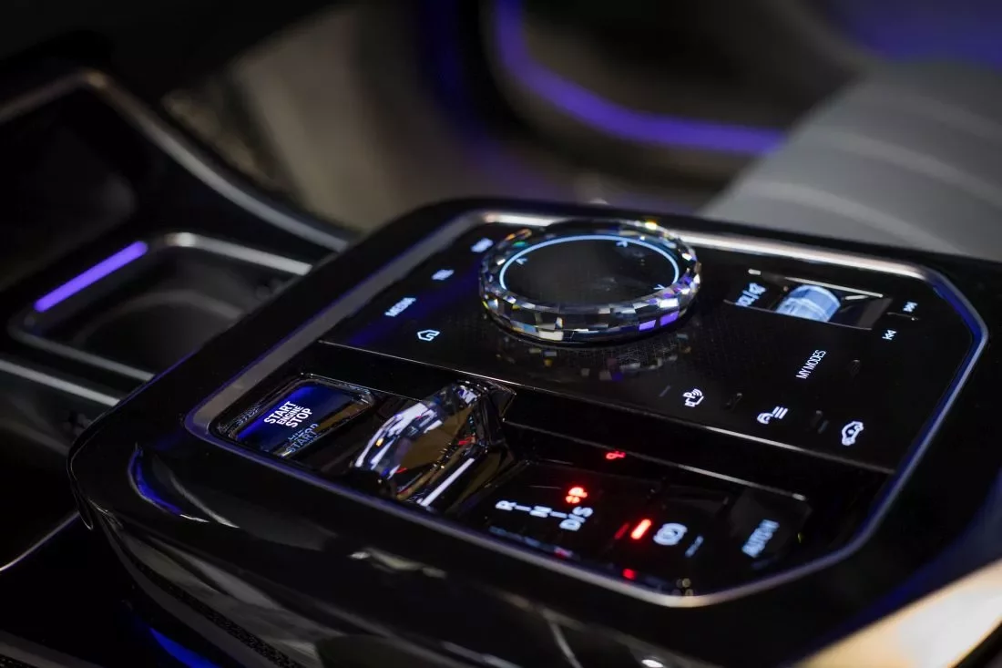 Stejně působivá jsou „křišťálová“ tlačítka na ovládání sedaček na dveřích, startovací tlačítko, volič převodovky, kolečko hlasitosti audiosystému nebo kolečko systému iDrive od Swarovskiho. Působí to luxusně a velmi netradičně.