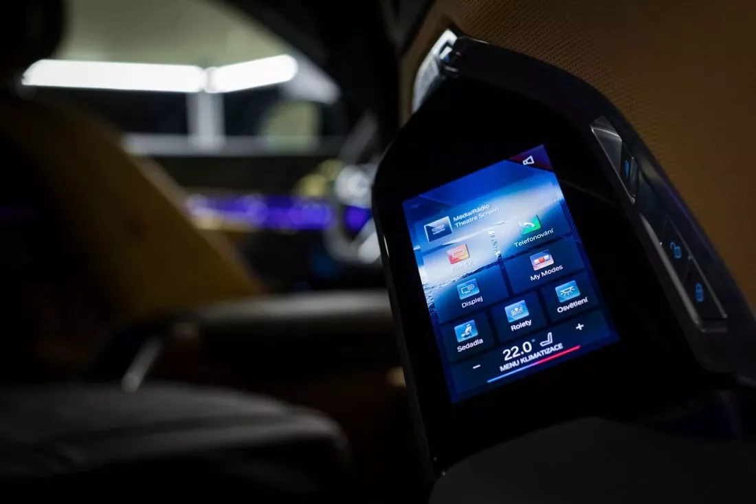 Jestli máte osypky z čehokoliv digitálního, potom vás vyděsí samostatný malý displej ve dveřích, jímž si můžete nastavovat úplně všechno. Od polohy sedadla až po ovládání televize. Vzadu to ovšem dává mnohem větší smysl, protože jako pasažér se dotykovým ovladačům máte prostor věnovat, zatímco jako řidič nikoliv.