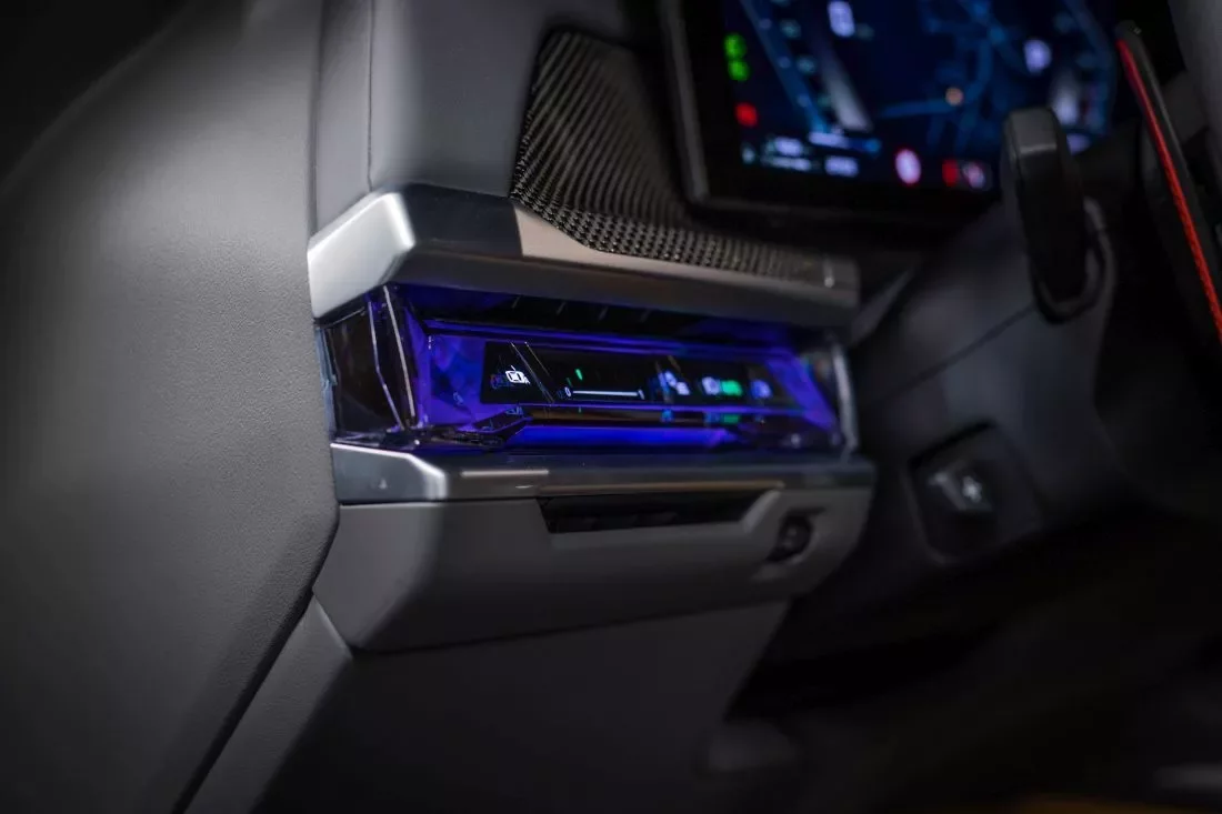 Pokud budete hledat výdechy klimatizace, vězte, že jsou schované v podobě nenápadných štěrbin právě pod osvětlenou lištou. Moc hezký detail.