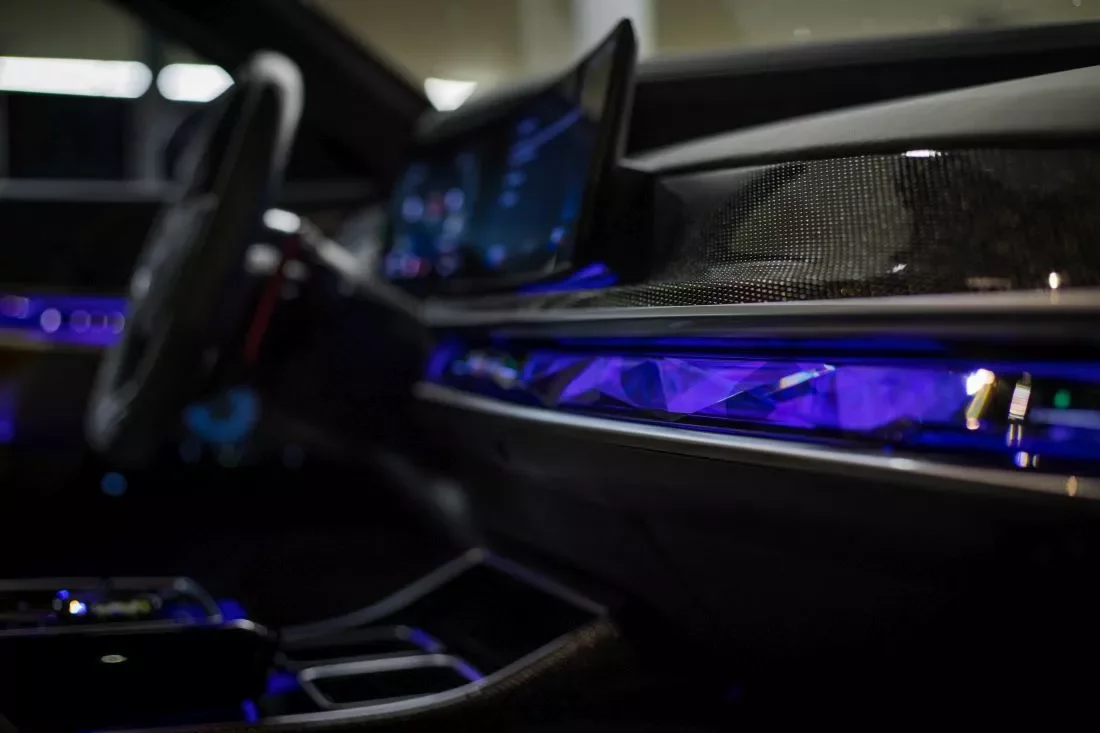 Do této skleněné podsvícené linky jsou integrovaná i základní dotyková tlačítka na paměť sedaček, otevírání dveří, ovládání světlometů nebo topení.