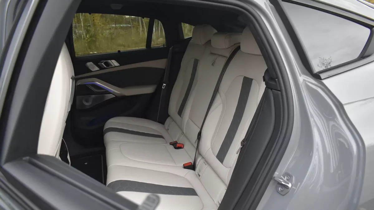 SUVčka se sportovní, tedy sklopenou zádí, mají občas omezený prostor na hlavu na zadních sedadlech. Takhle si to tedy pamatuji ze svezení s první generací verze X6. Tenhle nešvar je ale dávno odstraněn, aktuálně si cestující vzadu nemohou stěžovat, navíc díky menšímu zadnímu oknu (a vlastně i těm bočním) dozadu člověk příjemně vklouzne a díky luxusním materiálům si tam připadá jako v útulném baru s intimním osvětlením.