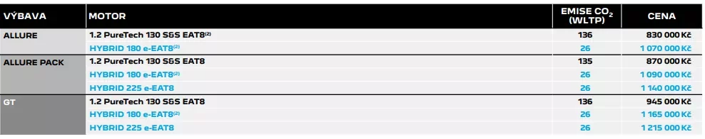 • PLUG-IN HYBRID 225 e-EAT8: pohon 2 kol / kombinace motoru PureTech o výkonu 180 k (132 kW) a elektromotoru o výkonu 81 kW ve spojení s osmistupňovou automatickou převodovkou e-EAT8