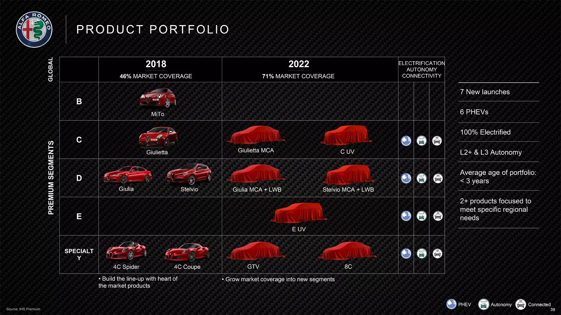 Nový plán automobilky zahrnuje pouze čtyři modely: Giulii, Stelvio a dvojici SUV segmentů B a C, které budou teprve oznámeny. Tento nový plán bohužel vynechává znovuzrozené modely GTV a 8C, jež byly součástí pětiletého plánu zveřejněného v loňském roce, který si můžete prohlédnout níže. Osud dalších modelů z pětiletého plánu je zatím neznámý.