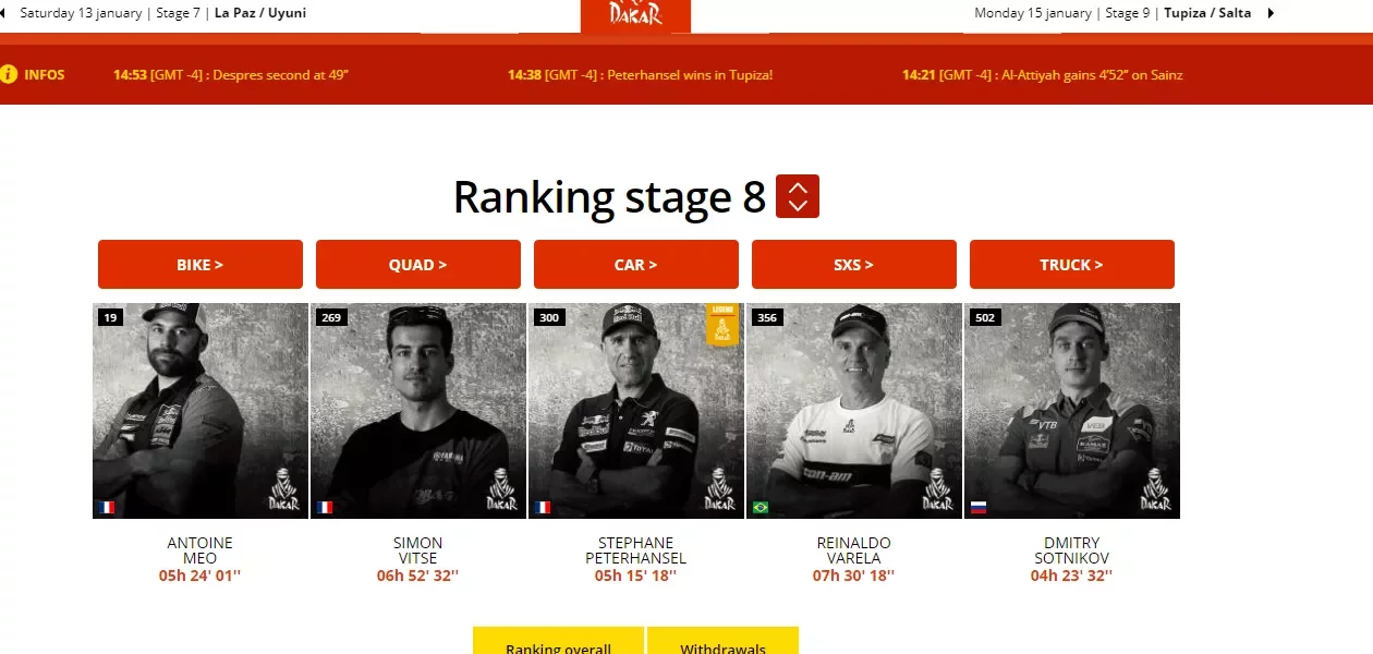 Osmý den na Dakaru byl úspěšným pro Antoine Meo, ten vyhrál mezi motorkami, anebo pro Simona Vitse, který bral za etapu pomyslné zlato mezi čtyřkolkáři. V kategorii kamionů dojel do cíle etapy jako první Dmitry Sotnikov.