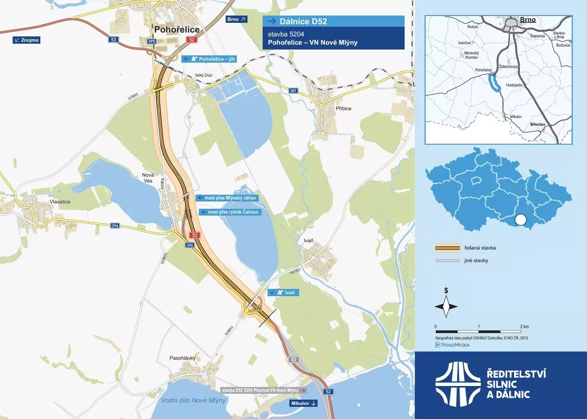 Očekávaná stavba dálnice D52 od Pohořelic k hranici s Rakouskem má celkem tři plánované úseky o celkové délce 23,1 km. Úsek z Pohořelic k Novým Mlýnům vyjde podle plánu ŘSD na 2,5 miliardy korun. Úsek z Nových Mlýnů na hranice s Rakouskem 4,1 miliardy. Ceny jsou uvedeny bez DPH. Doposud nejsou přesně vyčíslené náklady na úsek dálnice, který povede přes vodní dílo Nové Mlýny, ty závisí na technologickém řešení.