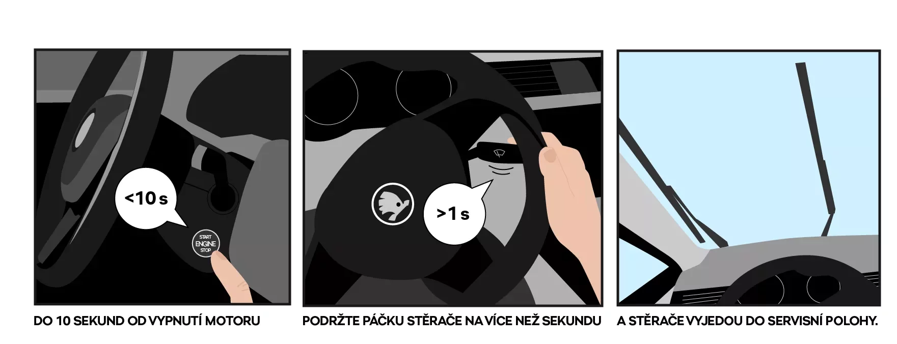 Jak u vozů Škoda vyvoláme servisní polohu stěračů? Do deseti sekund po vypnutí zapalování stlačíme páčku ovládání stěračů směrem dolů na více než jednu sekundu. Tím stěrače vyjedou do servisní polohy k A-sloupku. Pak už můžeme stěrače odklopit a lištu snadno vyměnit – nebo si tímto způsobem stěrače připravíme před očekávaným mrazem a noční sněhovou nadílkou.