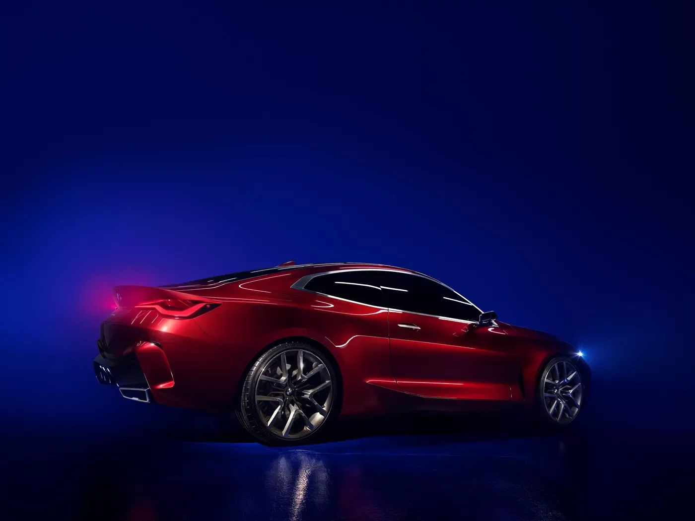 Zadní část BMW Concept 4 leží nízko nad vozovkou, což ke sportovnímu vozu patří. Boční linie přechází z boků do zadní části vozu v širokém horizontálním zlomu a vizuálně ještě více celou zadní část snižuje. Stejně jako přední části, také zádi dominují velkoryse dimenzované a čisté plochy s minimem křivek. Purismus prochází každým prvkem zadní části, kde vytváří nápadnou grafiku. Svislé nasávací otvory rámují spodní část zádi a zdůrazňují rozkročený postoj automobilu. Zadní LED světla jsou tvořena jediným optickým prvkem, který známému BMW tvaru v podobě písmene L propůjčuje grafiku „srdečního pulzu“. Jejich obrysy podtrhují sportovně horizontální orientaci zádi vozu a zdůrazňují její mohutnost. Design zadní části uzavírá výrazný difuzor integrovaný do muskulaturního nárazníku. Jeho vertikální lamely člení čisté plochy zádi a vysílají jasné poselství o špičkovém sportovním rodokmenu, zatímco leskle černá barva s kovovými částicemi mu propůjčuje další vizuální působivost. Dvojice koncovek výfuku se vyznačuje novým a dynamicky působícím lichoběžníkovým tvarem. Je detailem designu BMW Concept 4, který vyjadřuje vše, co tento vůz znamená: moderní pojetí vozu kupé, z nějž vyzařuje estetická přitažlivost z každého jeho póru.