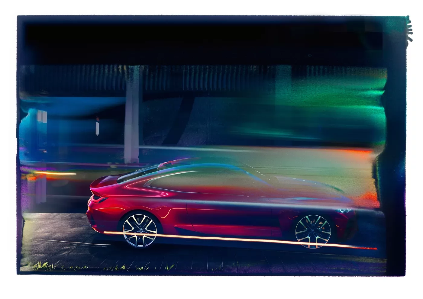 Koncept BMW Concept 4 zosobňuje charakteristické BMW proporce v jejich nejmodernější podobě. Protažená kapota, dlouhý rozvor, klesající střecha a krátké převisy vytvářejí moderní, elegantní a dynamickou siluetu kupé a prostřednictvím přikrčené karoserie vyzařují energii i ve chvíli, kdy automobil stojí. Ultra čisté plochy nového konceptu BMW Concept 4 tvoří z profilu hlavní část těla dynamické karoserie. Expresivní červená barva karoserie Forbidden Red obzvláště živým způsobem zvýrazňuje plochy automobilu, které na světle vyzařují pronikavou, lesklou červenou, zatímco stín vytváří téměř černý efekt a výrazný kontrast. Interakce obrysů a objemů proto vyvolává dramatický pocit lesku a hloubky.