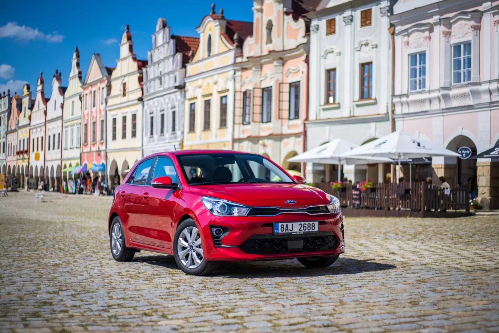 Do Telče jsme vyrazili Kiou Rio, která svými kompaktními rozměry zapadne do historických uliček Telče dokonale. Překvapí i vysokým jízdním komfortem na dálnici. Silnici č. 23 vedoucí do Telče si zase užijete díky skvěle naladěnému podvozku, který strčí do kapsy i sportovněji naladěné vozy.