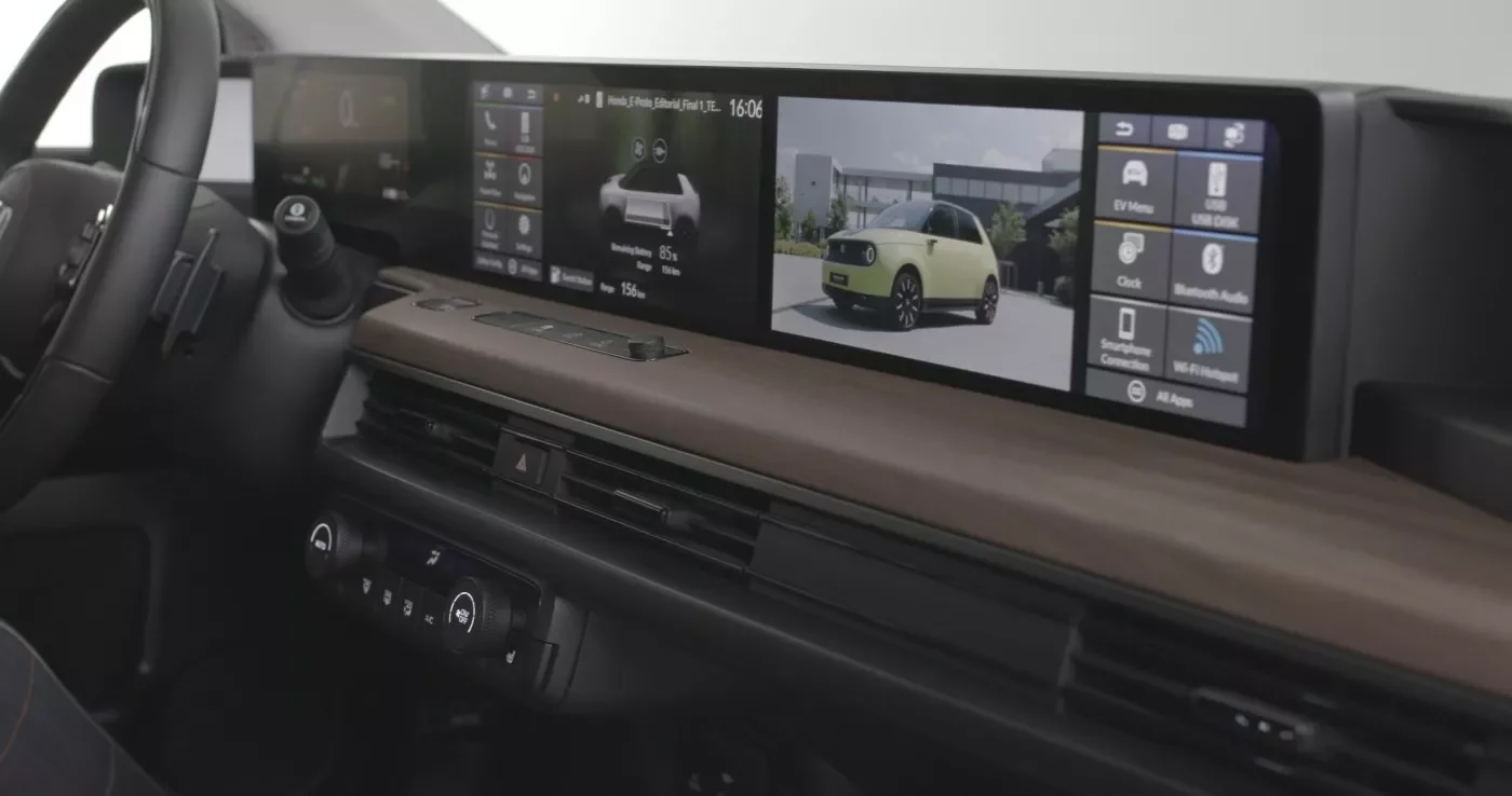 Největší plochu digitální přístrojové desky Honda e zabírají dva dotykové LCD displeje o velikosti 12,3 palce. Ty jsou primárně určeny pro informační a zábavní systém a zobrazují celou řadu inteligentních aplikací a služeb. Toto důmyslné, vysoce intuitivní a nastavitelné rozhraní bylo navrženo s důrazem na maximální použitelnost a posouvá vozidlo do sféry, kdy již není pouhým dopravním prostředkem, ale je plně začleněno do moderního životního stylu majitele.