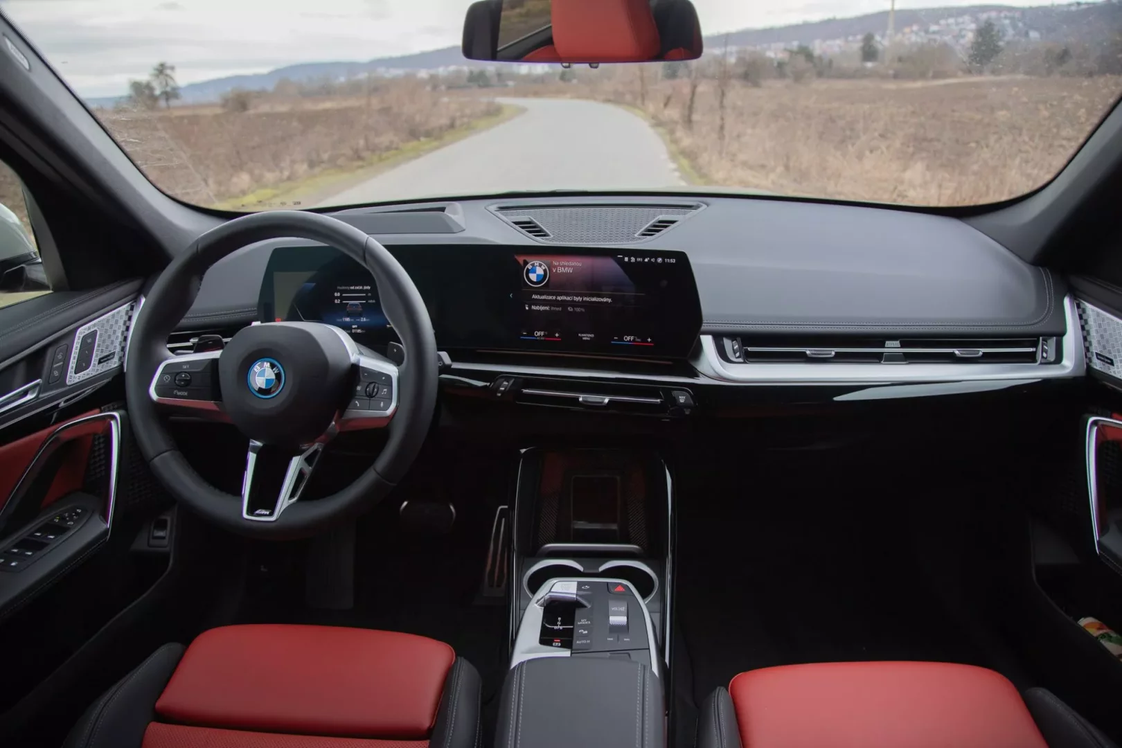 Už u spalovací varianty jsme chválili rozložení displejů, jejich příjemné a přesné vykreslení. A stejně taky tady si zaslouží pochvalu i celkový koncept interiéru, který byl v našem případě v M paketu. Sportovní sedačky v kombinaci barev černá/červená s celkem hlubokým vedením, sportovní kožený volant, prvky v pianinově černé doplnění chromovými detaily hrají velmi pěkně dohromady. Na autě je znát, že vyrostlo a že ho sice BMW řadí do svých „nejmenších“ SAV, ale v interiéru je to nabobtání znát.