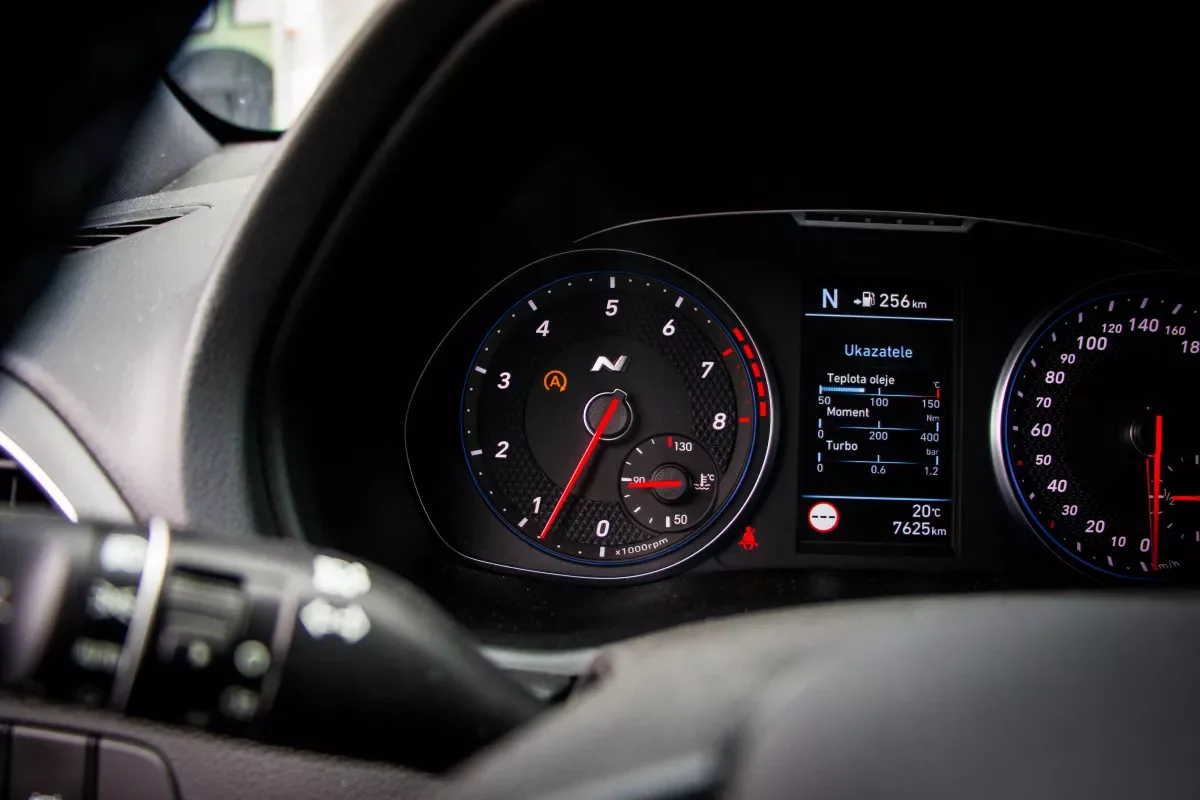 Sportovní auto, zvláště když je určené na okruhy, by vám mělo podávat informace o své životaschopnosti, což i30 N dělá. Na displeji multimédií můžete měřit časy nebo sledovat přetížení, točivý moment a plnicí tlak turba, což trochu jsou spíš hračky, které odvádí pozornost, nicméně na displeji mezi budíky můžete pozorovat i teplotu oleje. A to je naprostý základ.
