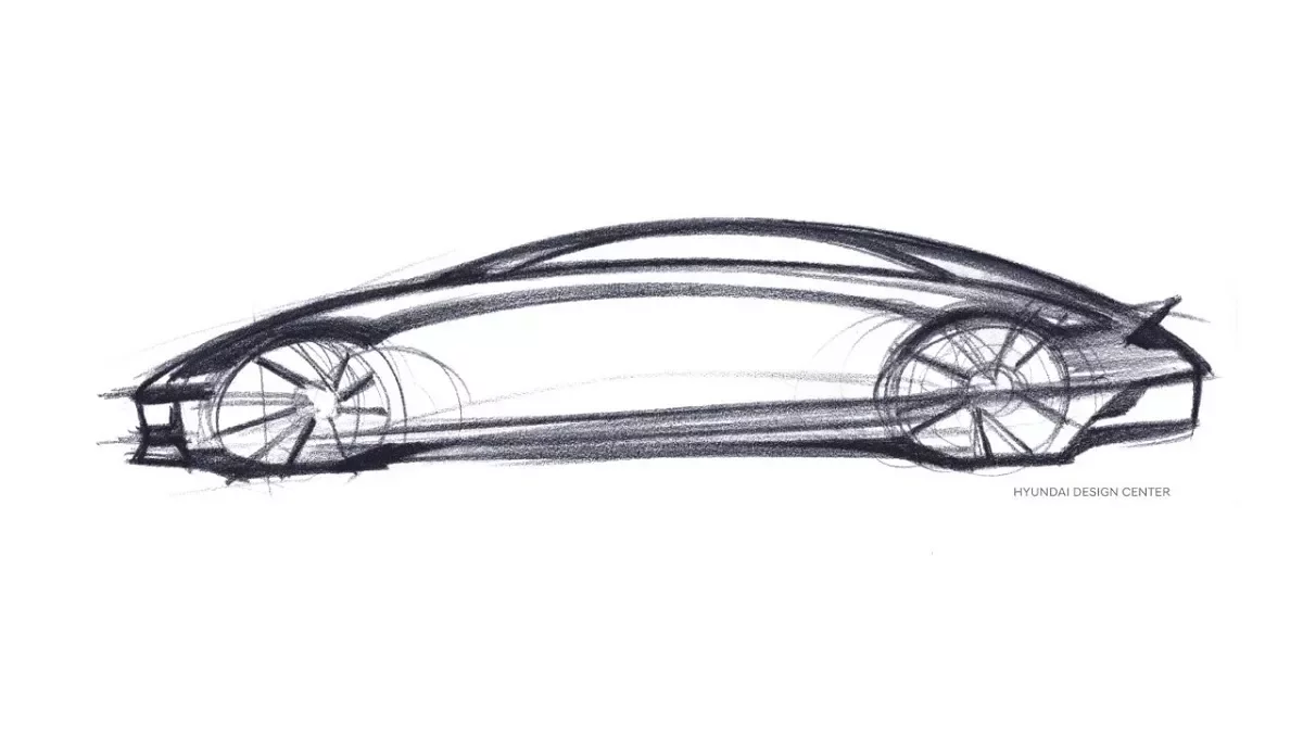 Ze skici je patrné, že se designéři značky Hyundai při návrhu aerodynamického designu zaměřili na uspokojení jak estetických, tak i funkčních požadavků zákazníků v éře elektromobility.