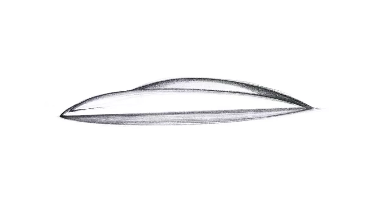 Koncepční skica zobrazuje jedinečnou a aerodynamickou siluetu modelu Ioniq 6. Nový Ioniq 6, inspirovaný konceptem Hyundai Prophecy, bude atraktivním čistě elektrickým modelem s čistými, jednoduchými liniemi a ryze aerodynamickými tvary.