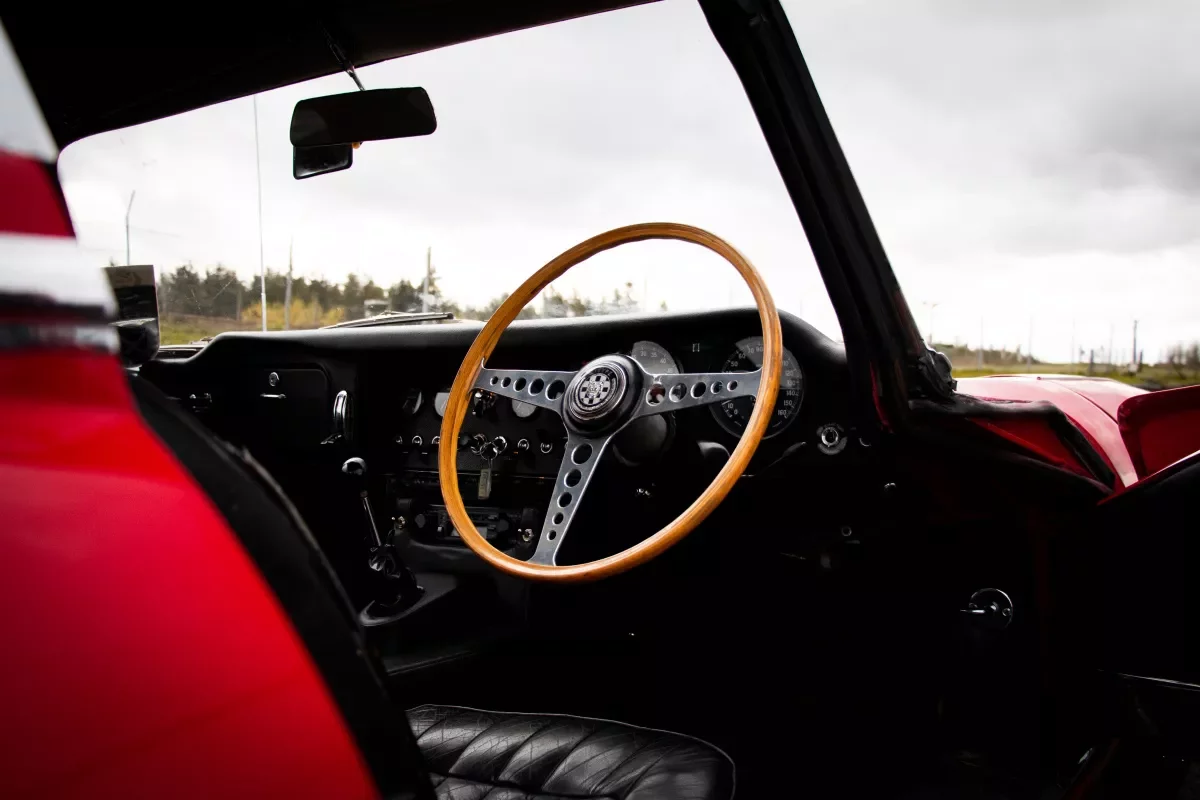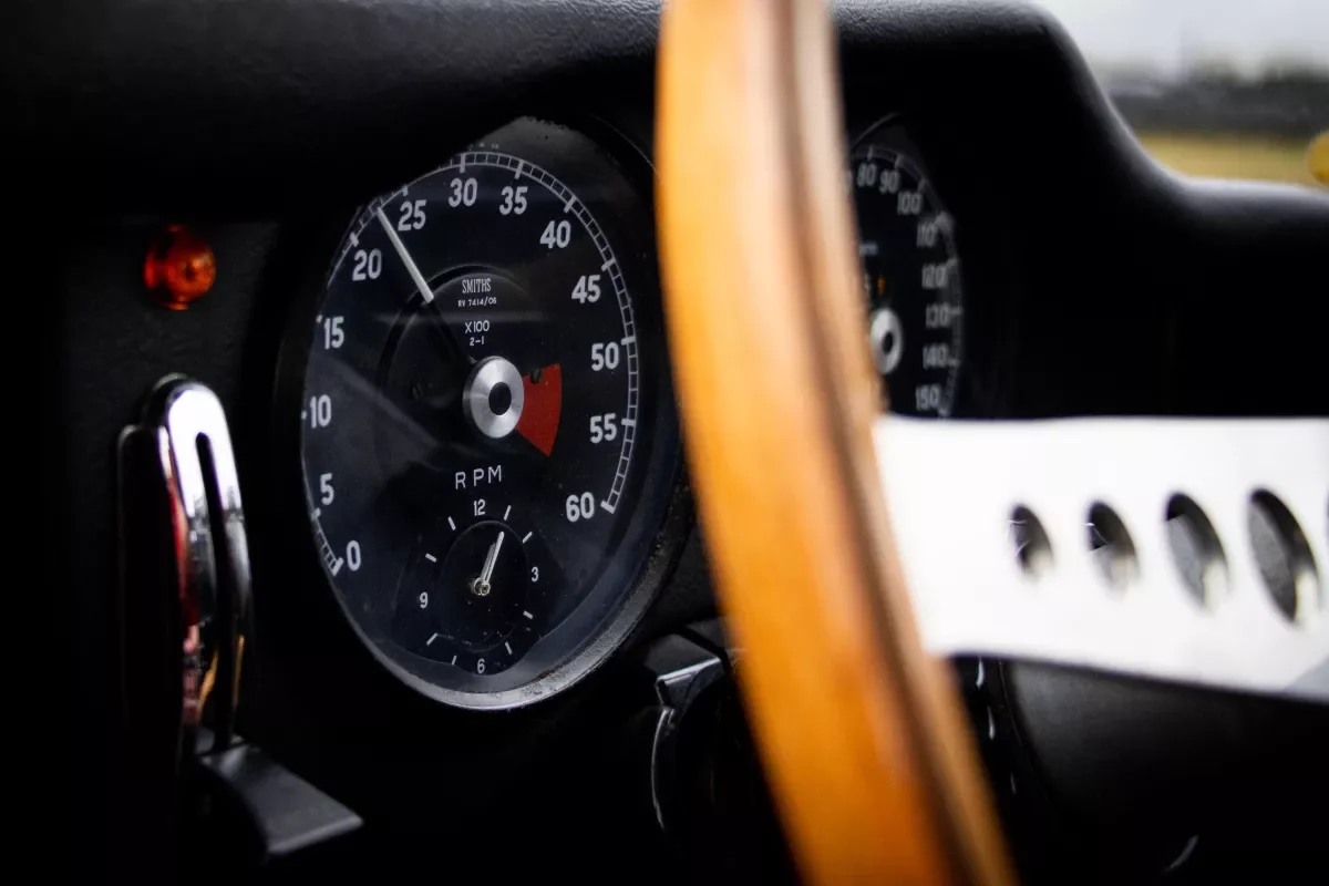 Dobová drátěná kola se spinnery potom odkazují na to, odkud tohle auto pochází – ze závodních okruhů. E-Type totiž stojí na základech D-Typu, který roku 1955, 1956 a 1957 vyhrál 24 hodin Le Mans. Ano, třikrát za sebou!