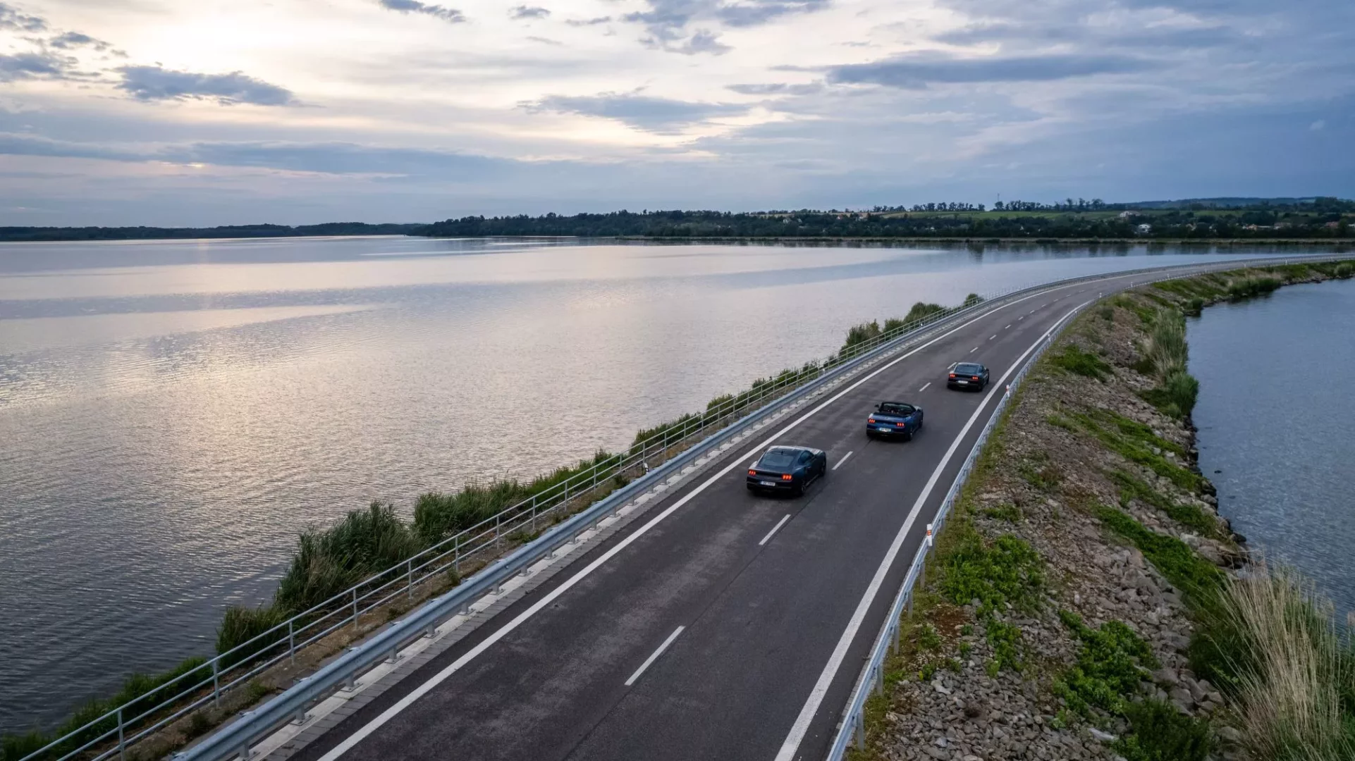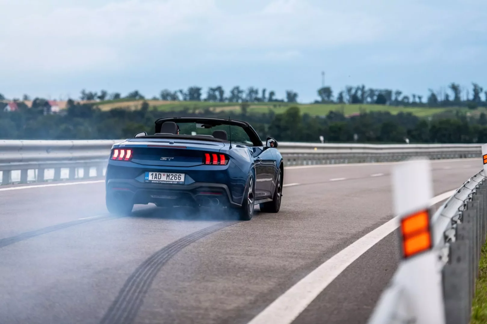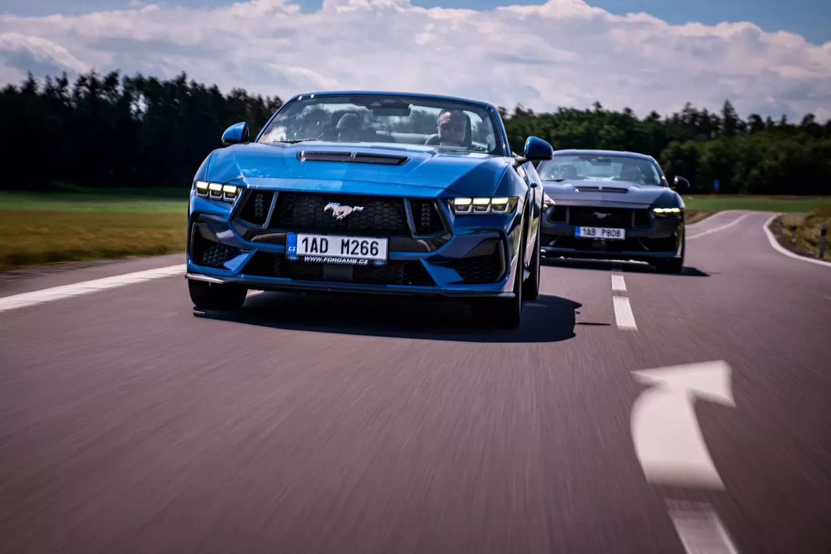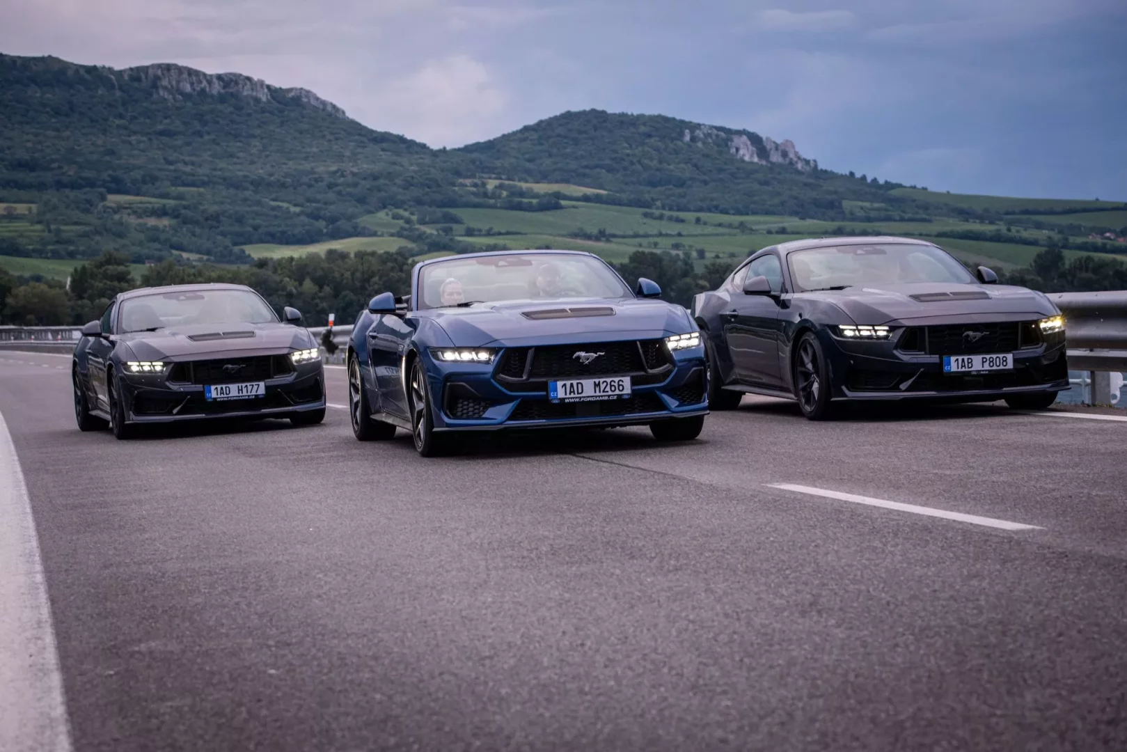 Usedáme do kabiny a startujeme. Ze všech hřebců se ozývá mohutné bublání V8. Slastný zvuk pětilitru, který u GT dokáže popohnat stádo 446 koní a u Dark horse 453 koní. Vybíráme si na cestu onu bezstřechovou variantu a tu sportovnější verzi přenecháváme kolegům. A je vidět, že děláme dobře. Konvoj tří silných strojů přitahuje po cestě pohledy řidičů okolních aut, kterým evidentně děláme dobrý den. Se spolujezdcem si po cestě chválíme odhlučnějí kabiny i napříč tomu, že máme vlastně plátěnou střechu. Kolegové v silnějších verzích si evidentně zase pochvalují, že dálnice nabízí místo pro vyzkoušení limitů nezkrotného plnokrevníka. Opravdová zábava ale nastává ve chvíli, kdy přejíždíme na okresky. U convertiblu stahujeme střechu a kocháme se krajinou. Naladění podvozku je měkké a pohodlné, je vidět, že se u Fordu snažili, aby jízda naplňovala jak sportovní pocit, tak ten cestovní, který nabídne komfort. U Dark Horsu je naopak patrné ono zakusování se do silnice, tvrdší podvozek s odpružením MagneRide a mnohem dynamičtější pohyb vpřed. Kvitování si rozhodně zaslouží ona stabilita, dobře zmiňovaný podvozek a především ono přímé řízení. Ono totiž řídit tak silné auto zmanená, že víte, co děláte. V tomhle případě si můžete být jisti, že vás Mustang podrží, což se o mnohých sportovních autech říci nedá. Inženýři se posnažili, abyste v oři měli parťáka a ne přítěž, což je chvályhodné. Proto zapracovali i na brzdách, které jsou o poznání ostřejší.