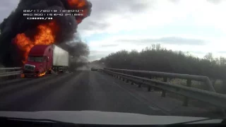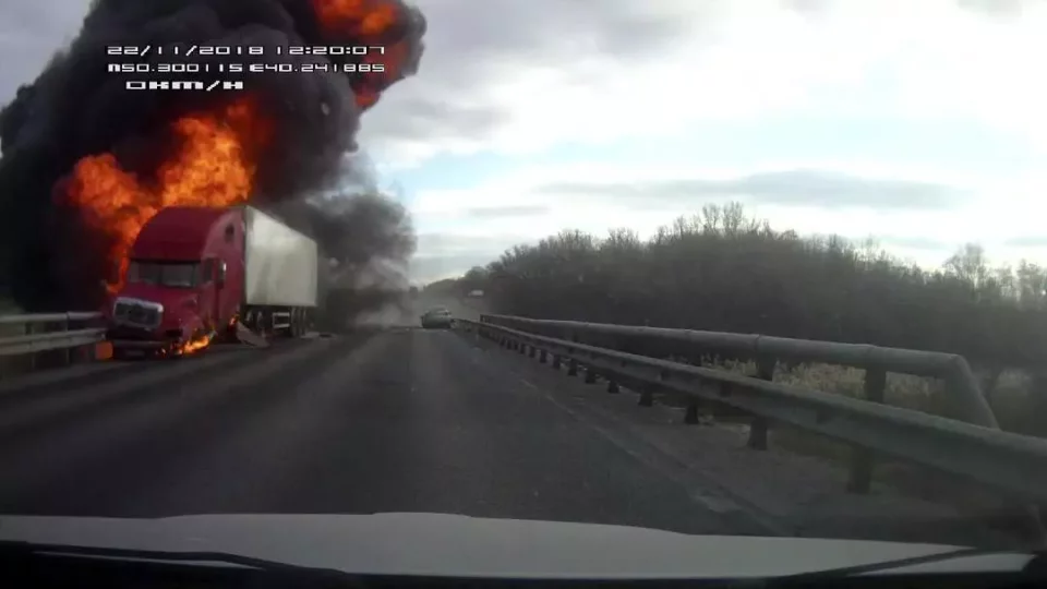 Nákladní auto po střetu s osobním vyjelo mimo silnici a najelo na svodidla. V jediné sekundě z tahače vyšlehly plameny a došlo k velkému výbuchu. Vůbec netušíme, co mohlo takovou explozi, a tak velké plameny způsobit, ale nejspíš jiskry od nehody v kombinaci s palivem. I tak je to ale hodně zvláštní podívaná.