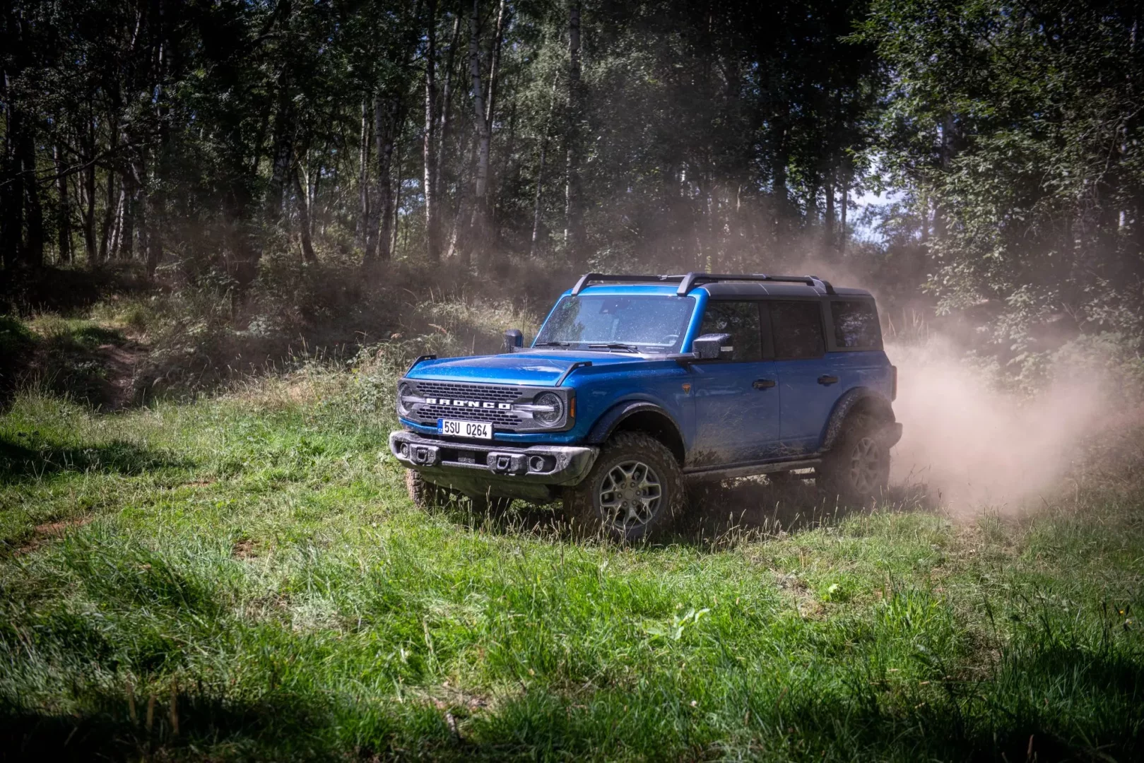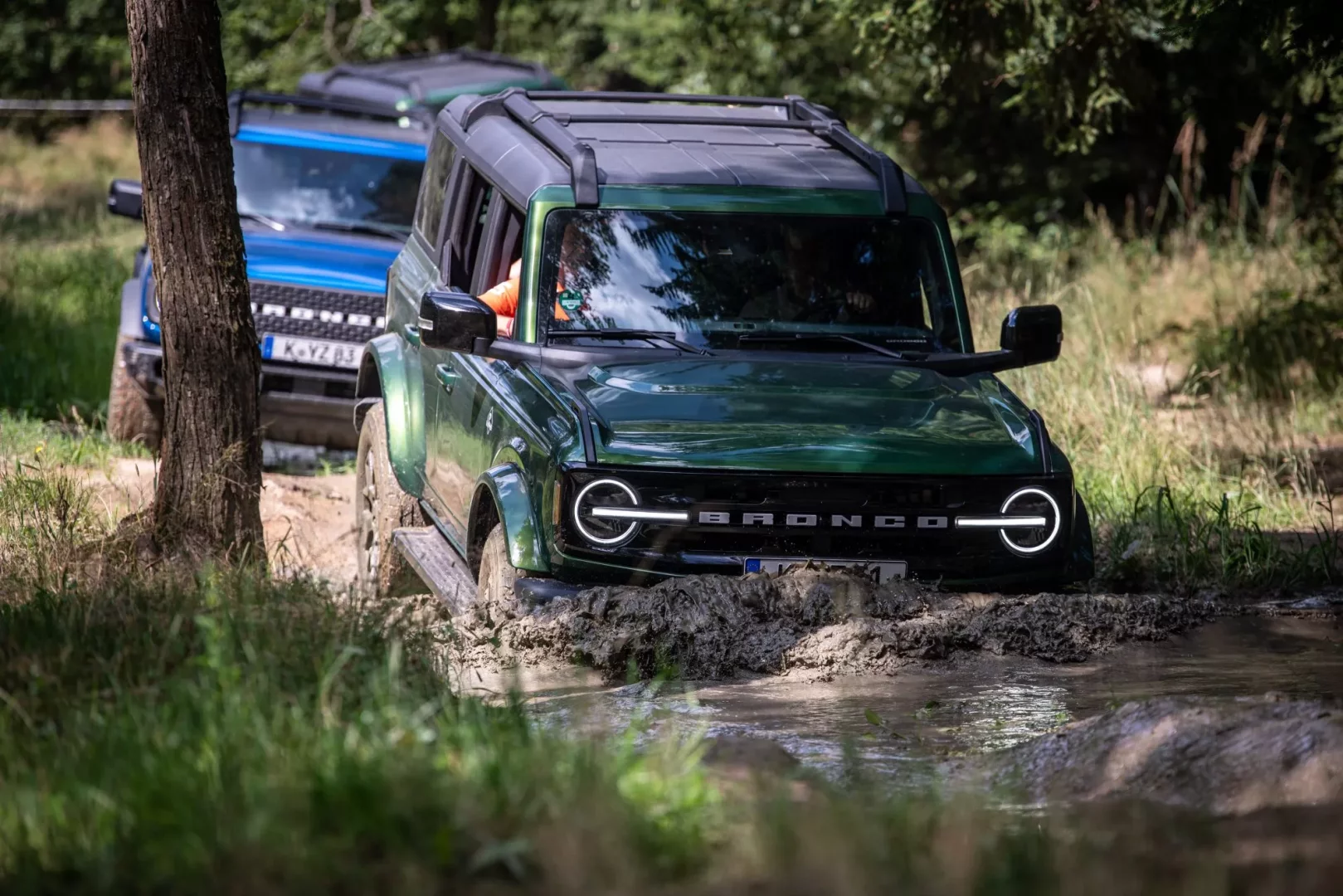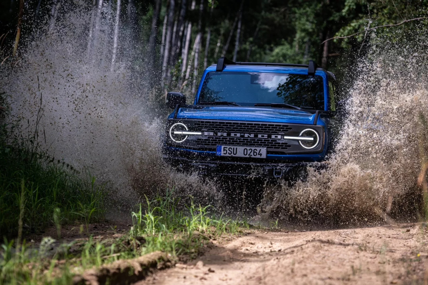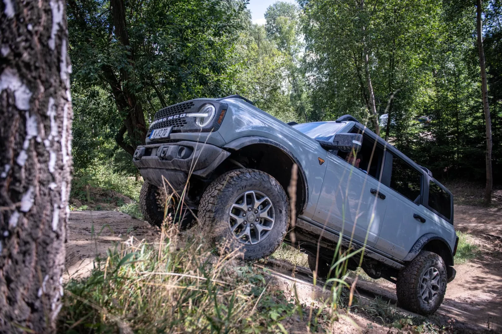 Po přesvědčení, že Bronco stojí pevně v kramflecích na klasickém povrchu, ho bereme do těžšího terénu, který se skládá z brození v mokřadech, prudkých výjezdů a sjezdů a úzkých průjezdů. Do přírodního „brouzdaliště“ vjíždíme s oběma verzemi Bronca, a to jak s Outer Banks, která je pro takovou stylovější jízdu a má například plastový přední nárazník a nástupní schůdek. Na rozdíl od verze pro drsnější jezdce Badlands, která se vyznačuje ližinami chránícími prahy karoserie, ocelovým předním nárazníkem a ocelovou ochranou podvozku a uzamykatelným předním diferenciálem.