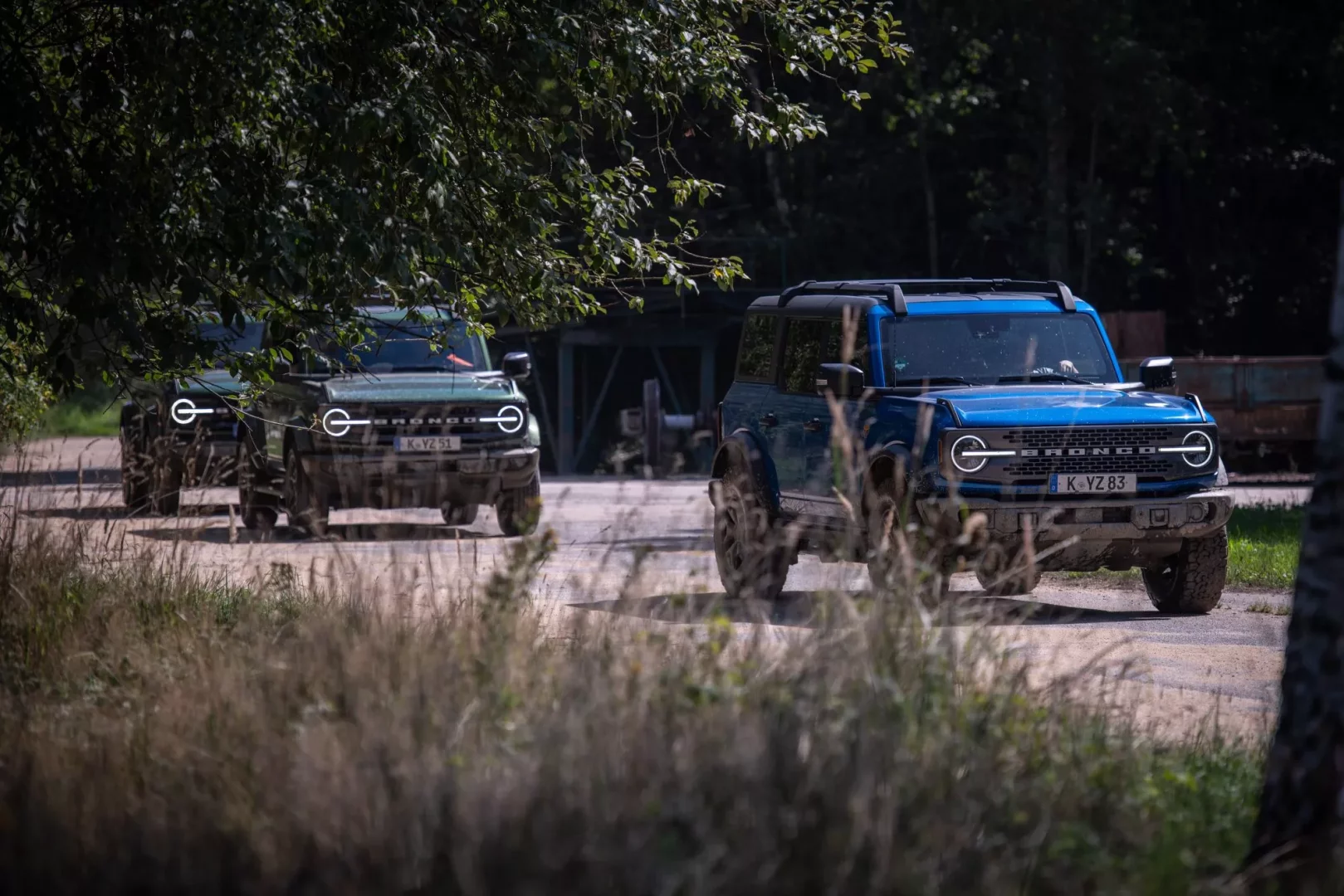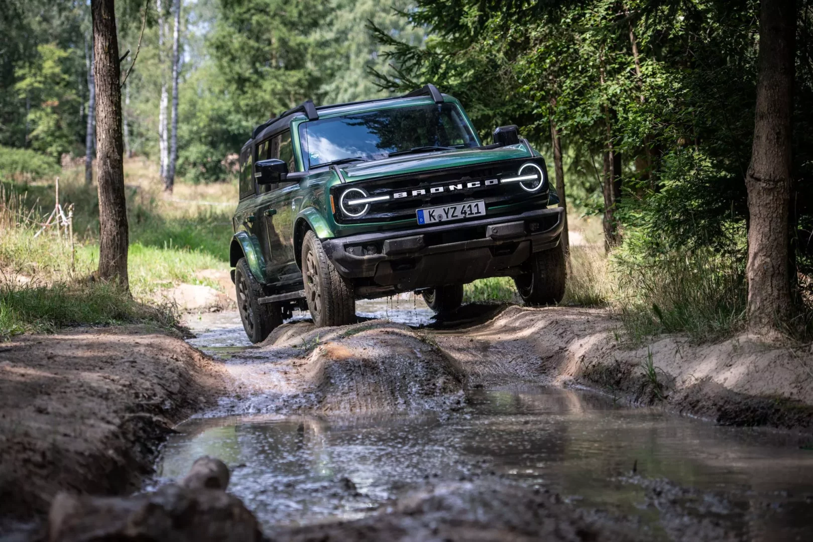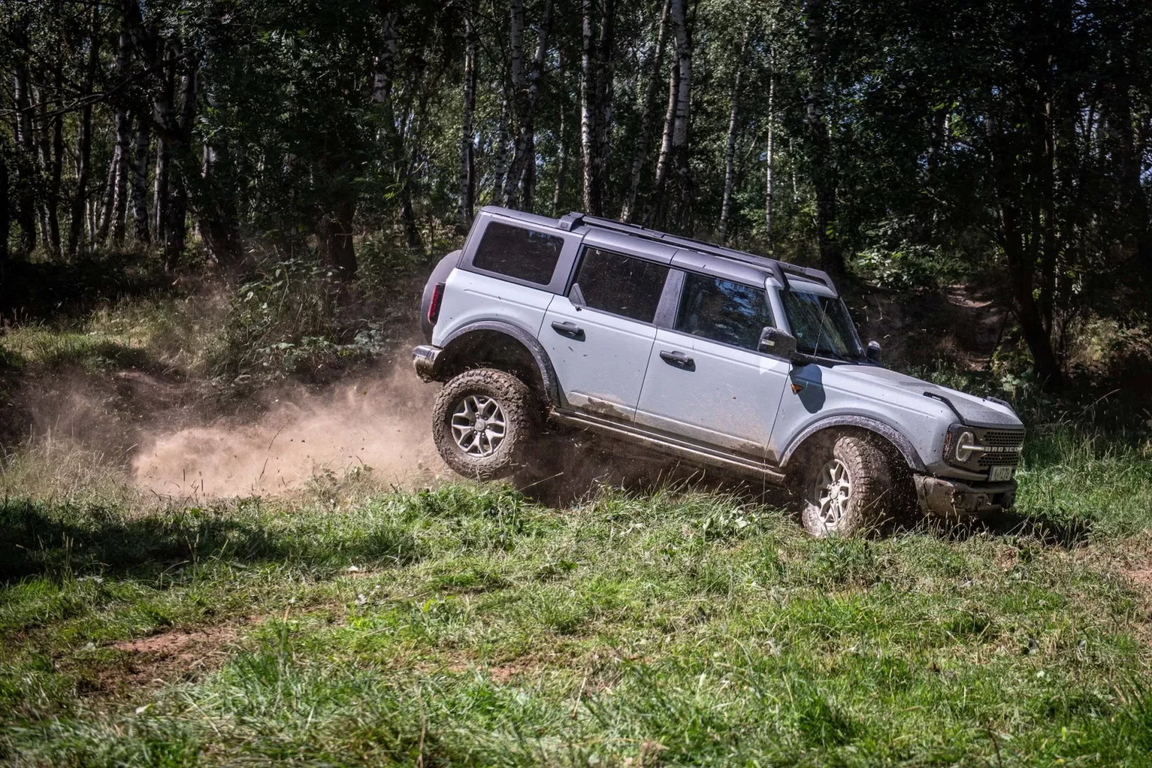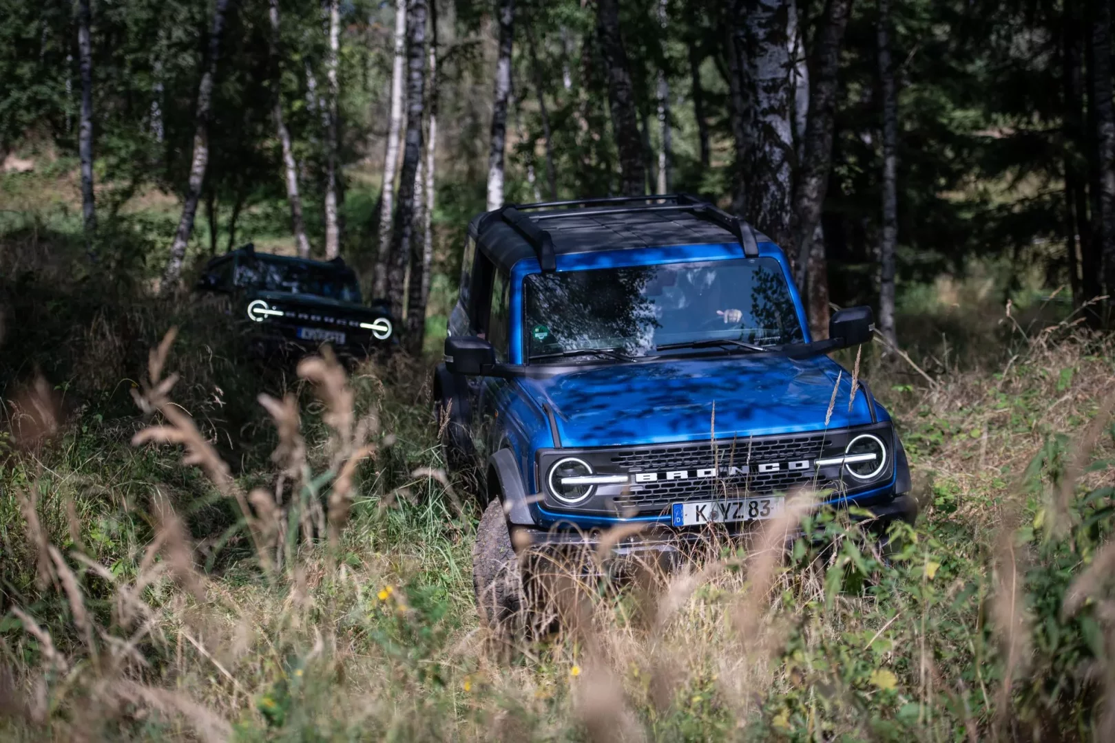 Po přesvědčení, že Bronco stojí pevně v kramflecích na klasickém povrchu, ho bereme do těžšího terénu, který se skládá z brození v mokřadech, prudkých výjezdů a sjezdů a úzkých průjezdů. Do přírodního „brouzdaliště“ vjíždíme s oběma verzemi Bronca, a to jak s Outer Banks, která je pro takovou stylovější jízdu a má například plastový přední nárazník a nástupní schůdek. Na rozdíl od verze pro drsnější jezdce Badlands, která se vyznačuje ližinami chránícími prahy karoserie, ocelovým předním nárazníkem a ocelovou ochranou podvozku a uzamykatelným předním diferenciálem.
