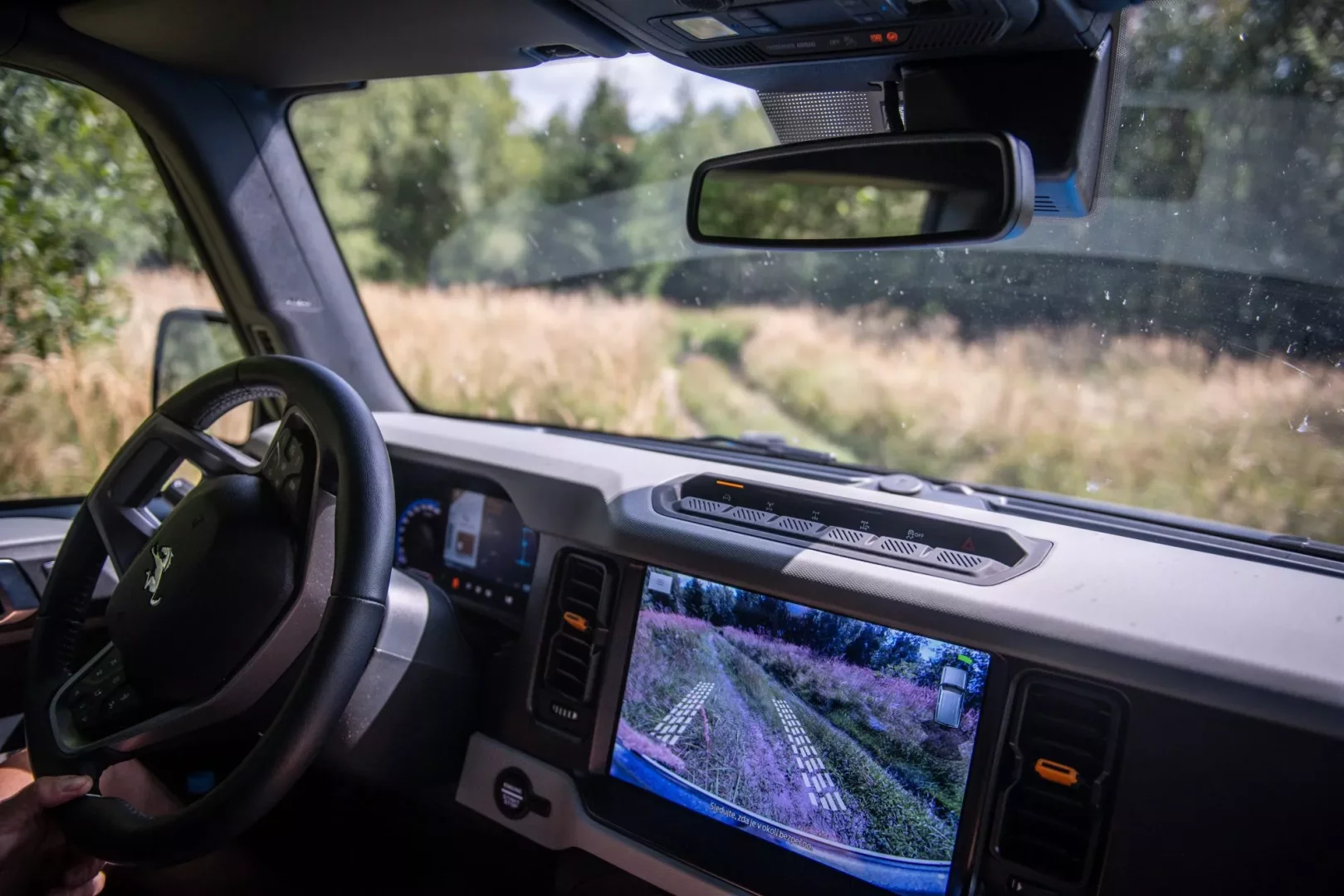 Cesta v terénním speciálu je na dálnici až překvapivě pohodlná. A to i napříč tomu, že má obuty, sice 18palcové disky, ale na nich posazené 32palcové pneumatiky All-terain (verze Outer Banks). Je trochu hlasitější, což můžeme připsat ale modulární hard-top střeše, která se dá z auta jednoduše odendat. Ano, Bronco si můžete celé odstrojit a pak mít reálně „holý“ vůz bez dveří/oken a střechy. Tohle je sen každého dobrodruha (samozřejmě v terénu, ne na dálnici). Mimochodem odstrojení dveří vám zabere 8 minut. Celé auto vám pak vezme přibližně minut 20.