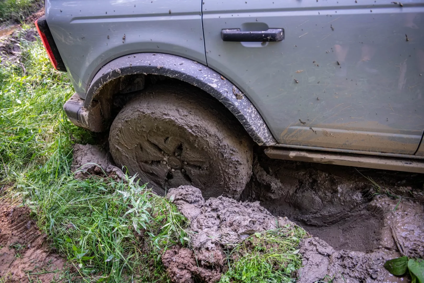 A teď ta koupačka aneb Brození v bahně. Na otočném ovladači, kde je výraznými písmeny napsáno G.O.A.T (Goes-Over-Any- Terrain) si volíme režim Bahno, auto samo upravuje převodovku do 4L a optimalizuje vše, abychom mohli bahnem pohodlně projet bez problémů. Díky brodivé výšce 800 mm jsme naprosto v klidu a nerozhází nás ani větší bahnité jezírko. Základem je všechno dělat s rozvahou a pomalu, rychlá jízda vám zde v ničem nepomůže. Přesné a plynulé pohyby znamenají pro řidiče naprosto slastný zážitek. Bronco poslouchá pokyny a nezastaví ho ani kluzký povrch. A i když přeci jen sklouznete po nějaké hraně mokrého kamene nebo rozbahněného terénu, uslyšíte lehké cinknutí – to se ozve robustní zakrytování celého podvozku. Není proto potřeba se bát.
