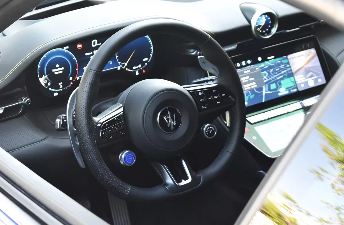 Interiér kombinuje eleganci, luxusní materiály a jednoduchost. Sedadla jsou poctivě prošívaná a pohodlná, drží v zatáčkách, ale taky netlačí a dovolí pohodlné cestování. Jsou to taková závodní křesla. Jednoduchému volantu vévodí ikonický trojzubec, nad obrazovkou infotainmentu jsou decentní a šik hodiny.