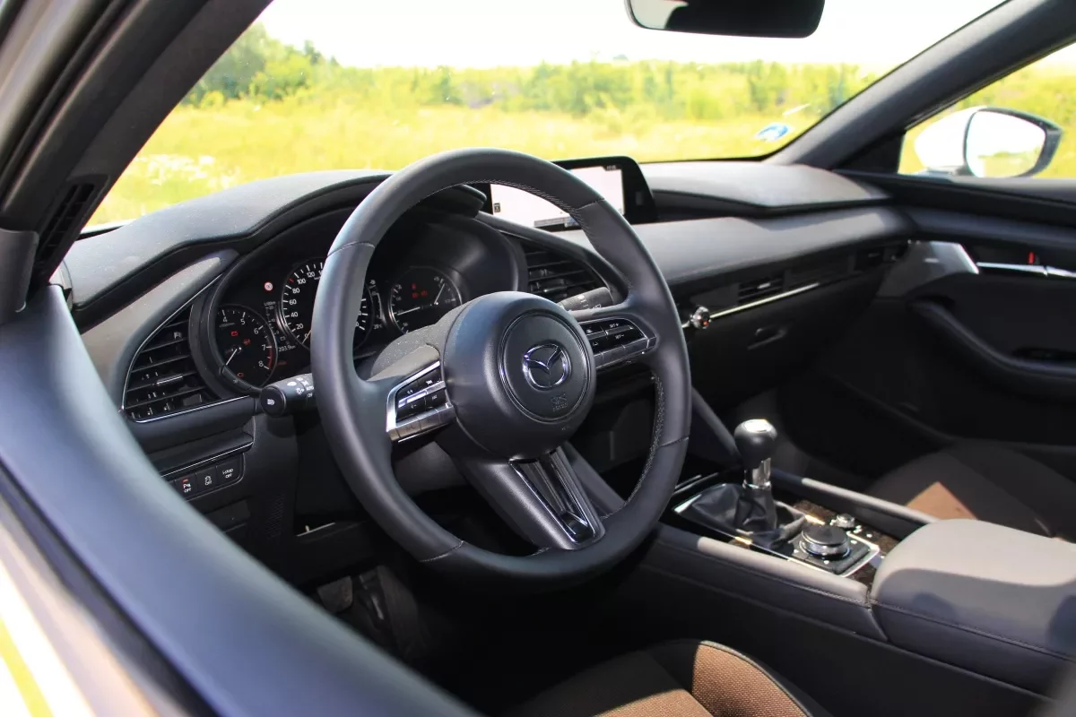 Návrháři zapracovali i na interiéru, který je dobře odhlučněný a vyznačuje se výbornou ergonomií. Volant má tenký věnec, takže se dobře drží, sloupek řízení umožňuje rozsáhlé výškové i podélné nastavení, sedadla jsou pohodlná a palubní deska nepřekáží kolenům. Ačkoliv nízká střecha vytváří dojem stísněnosti, interiér je celkem prostorný. Horší je to s výhledem dozadu, který značně narušují masivní C-sloupky a nízká zadní boční okna. Kvůli tomu je Mazda 3 vybavena kamerami, jimiž lze při vycouvávání sledovat prostor okolo vozu. Nový infotainment vsází na jednoduchost, díky čemuž je přehledný a má rychlou odezvu.