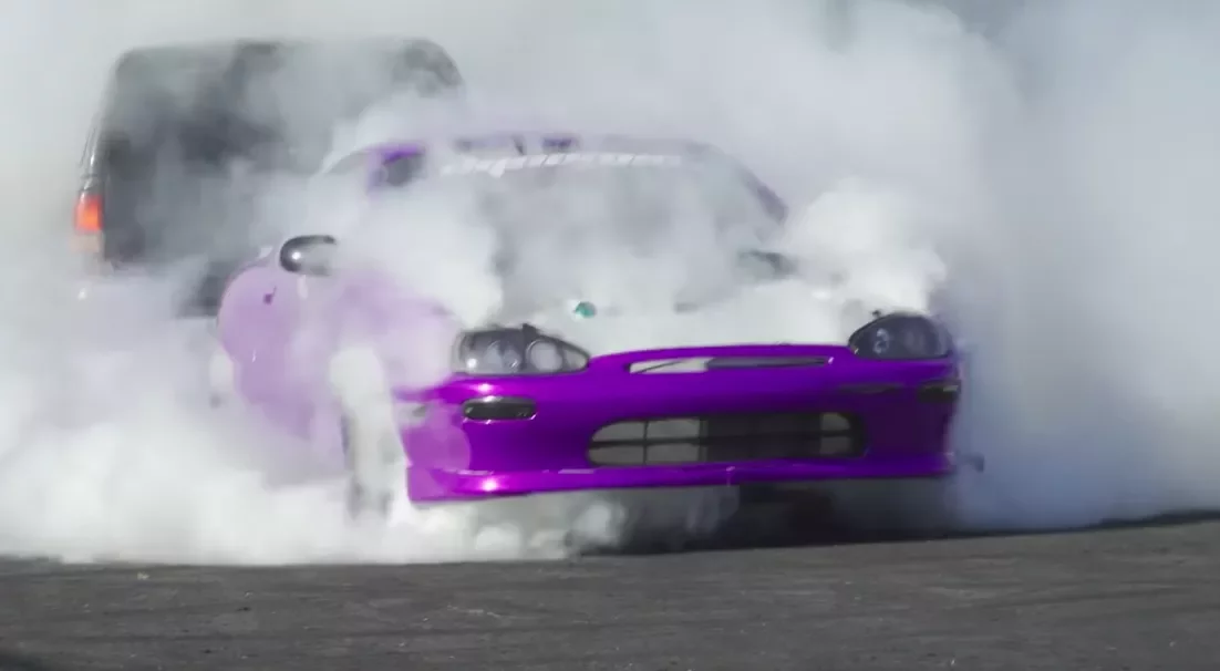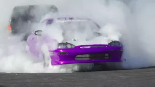 A to ještě není všechno. Hlavní párty-trik téhle šílené Mazdy je současné zařazení jedničky na jedné nápravě a zpátečky na druhé. V tom momentě se samozřejmě kola na přední a zadní nápravě točí v opačném směru, následkem čehož je naprostá anihilace pneumatik doprovázená mračnem kouře.