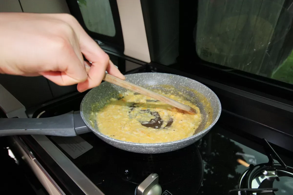 Uplynula další noc pod střechou stanu na kolečkách za 2,8 milionu a přichází čas snídaně. Konečně využijeme všechno kuchyňské vybavení naplno. Jaké nás čeká překvapení, když sáhneme do lednice pro vajíčka, která jsou omrzlá. Maximální výkon ledničky se na první pohled nezdá, ale klidně by tu chvíli vydržely i nanuky. To platí pro obě ledničky. Jelikož je ráno oproti večeru jako malované, posedíme pod markýzou.