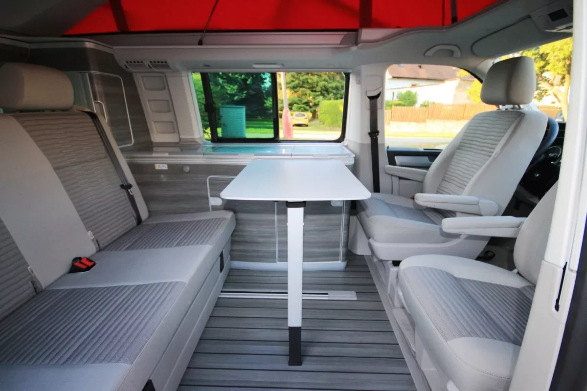 Večer nás zastihne pořádný liják, takže nacházíme útočiště uvnitř. Nejvyšší čas vyzkoušet otáčení předních sedaček. V Californii jdou otočit pouze o 180 stupňů, v Marco Polu můžete mít obě sedačky i našikmo – potom se u vnitřního stolku lépe sedí, i když pohodlnější je to přece jenom na zadní lavici. Oba stolky jsou ve výchozí pozici složené na přední straně lednice, stačí jenom zatáhnout, vyklopit vzhůru, vyklopit nožičku a je to. Systém v Mercedesu je jednodušší, když stačí nohu pouze vyklopit, ve Volkswagenu musíte ještě nohu krkolomně vysunout do delší pozice.