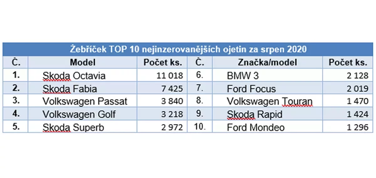 Žebříček ojetých vozů s největší nabídkou na trhu tradičně vede Škoda Octavia následovaná Škodou Fabia a Volkswagenem Passat. Změna oproti červenci nastala na 6–9 příčce, kdy si pořadí vyměnily vozy BMW 3 a Ford Focus, ve druhém případě VW Touran a Škoda Rapid. Desítku uzavírá Ford Mondeo.