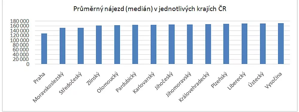 S velkým náskokem co do počtu nájezdu inzerovaných vozů vládne této statistice Praha. Zde nejčastější nájezd činí 128 454 km. Druhé místo zaujímají shodně kraje Středočeský a Moravskoslezský se 152 000 km, čtvrté místo náleží Zlínskému kraji (162 000 km). Na opačném konci jsou kraje Liberecký (169 837 km), Ústecký (170 750 km) a Vysočina (171 000 km).