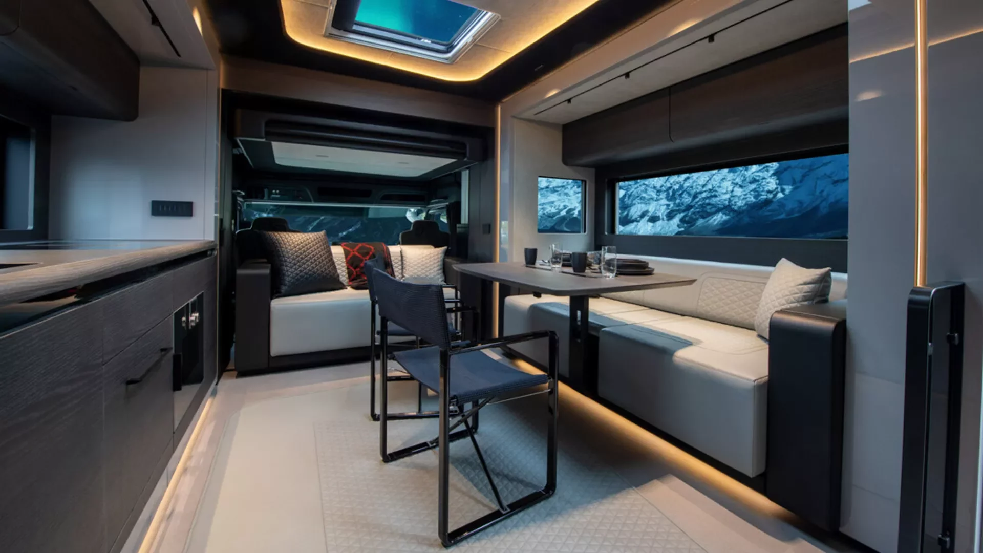 Po vstupu pomocí elektrických sklápěcích schodů už vás uvítá interiér, který nelze označit jinak než jako esenci luxusu. Řidič a spolujezdec sedí na perforovaných kožených sedadlech s prošíváním ve tvaru diamantu, nad nimiž lze sklopit 160 cm širokou postel. Obývací prostor nabízí dvě pohovky s čalouněním shodným se sedadly, prémiový koberec a dekorace z matného dřeva a Alcantary, tedy imitace broušené kůže.