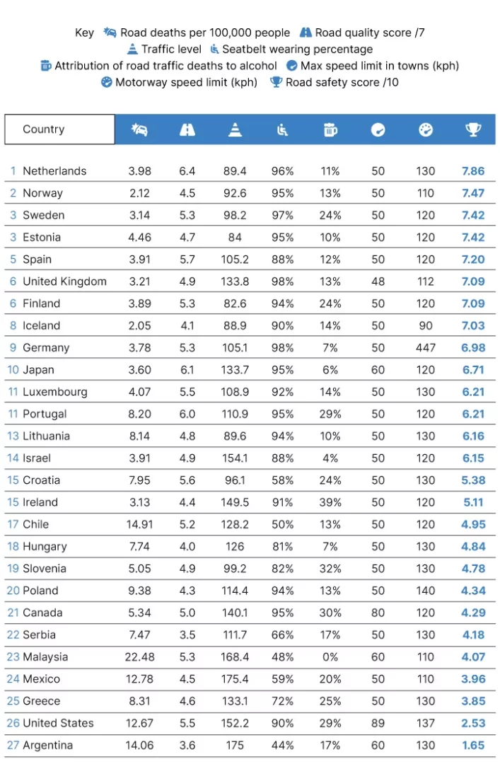 Jako absolutně nejbezpečnější provoz byl ohodnocen ten nizozemský. Body získal především za kvalitu silniční sítě a také v kategorii používání bezpečnostních pásů. Naopak trochu ztratil v počtu úmrtí při dopravních nehodách na 100 000 obyvatel (3,98). Zdroj uvádí, že nejbezpečnější automobilová doprava v tomto hodnocení je daná také množstvím cyklistů. V Nizozemsku připadá jedno jízdní kolo na jednoho obyvatele. Více lidí využívajících kolo by mělo znamenat méně aut v provozu a tudíž lepší bezpečnost. Na druhém místě skončilo Norsko především kvůli nízkému počtu úmrtí na 100 tisíc obyvatel a velmi nízkému rychlostnímu limitu na dálnicích. O třetí příčku se dělí Švédsko a Estonsko.