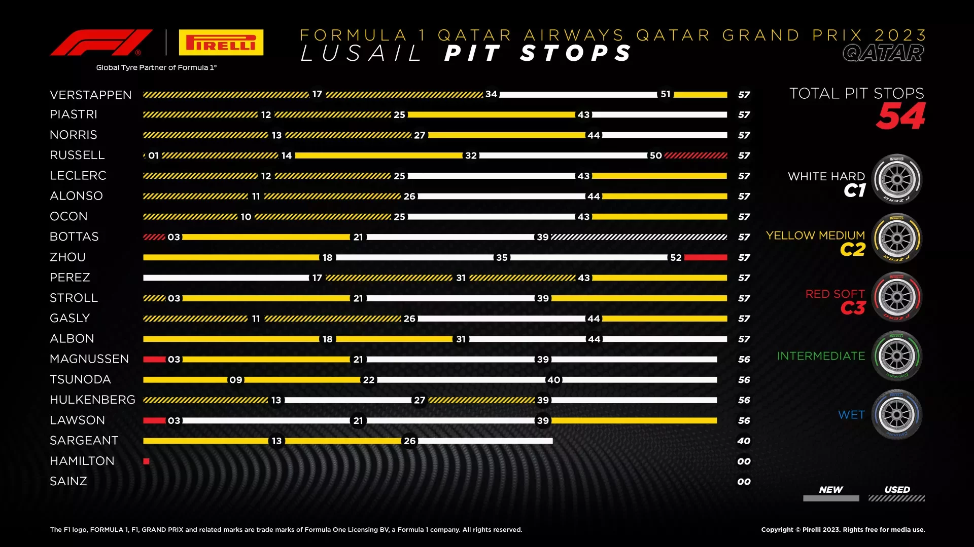FIA v návaznosti na to přijala po konzultaci s jezdci neobvyklé opatření. Během závodu jezdci nesměli na pneumatikách ujet více než osmnáct kol a podívaná na nedělní závod to byla bez přehánění bizarní. Pirelli vydává po každých závodech zajímavé statistiky a jednu takovou si můžete prohlédnout na obrázku níže. Všichni jezdci využili během závodu čtyři různé sady a v boxech byli třikrát. Na nejrychlejších červených pneumatikách ujel nevíce kol ze všech George Russel a těch kol bylo pouze sedm. Během závodu bylo dohromady zaznamenáno padesát čtyři pit-stopů.