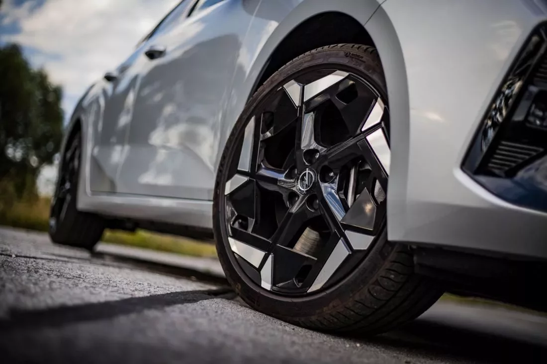 Astra GSe jistě boduje vzhledem. Ostře řezané panely karoserie, černá maska chladiče a další detaily, parádní 18palcová kola, spojler na víku kufru s třetím brzdovým světlem à la závoďák, to všechno hraje na emoce.