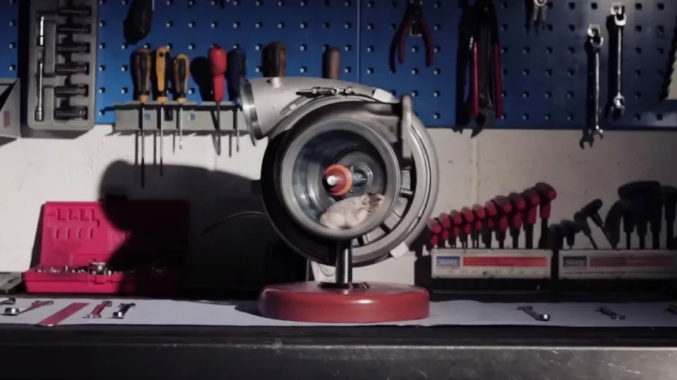 Kdyby se vám tedy v garáži náhodou povalovalo jedno nepotřebné turbo, a v kleci zase jeden obtloustlý křečík, víte, co máte dělat. Takovéhle běhací kolečko bychom si také přáli...
