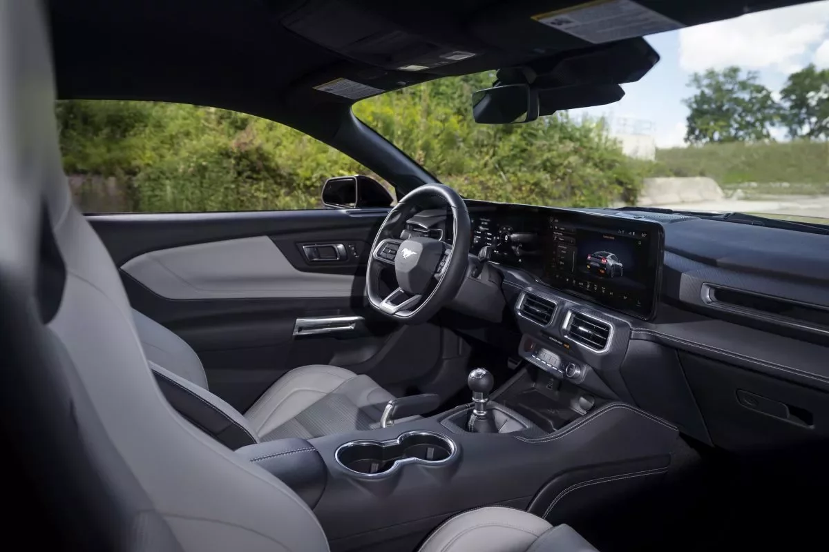 Plně přizpůsobitelné digitální přístroje a atmosféra interiéru Mustangu začínají měděnými a tmavými odstíny v podobném duchu jako v SUV Mustang Mach-E. Displeje sdružených přístrojů i ambientní osvětlení interiéru lze ncméně nakonfigurovat v zákazníkem zvolených tónech, přičemž grafika přístrojů se přizpůsobuje také aktuálnímu jízdnímu režimu. Při volbě personalizovaného jízdního režimu se na středovém panelu zobrazí vizualizace nastavení vozu pomocí softwaru Unreal Engine 3D, což je počítačový herní engine, který vykresluje grafiku v reálném čase. Interakcí s dotykovým displejem lze upravovat nastavení vozidla a přejetím prstu po grafice virtuálně otáčet vozem.