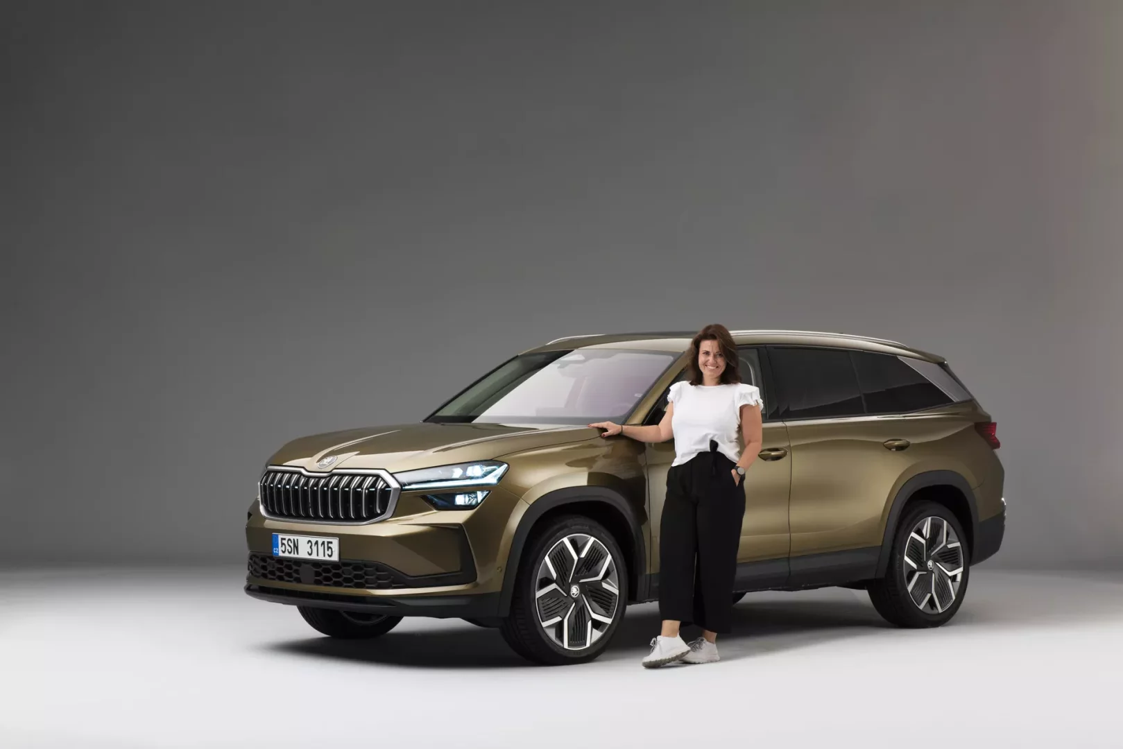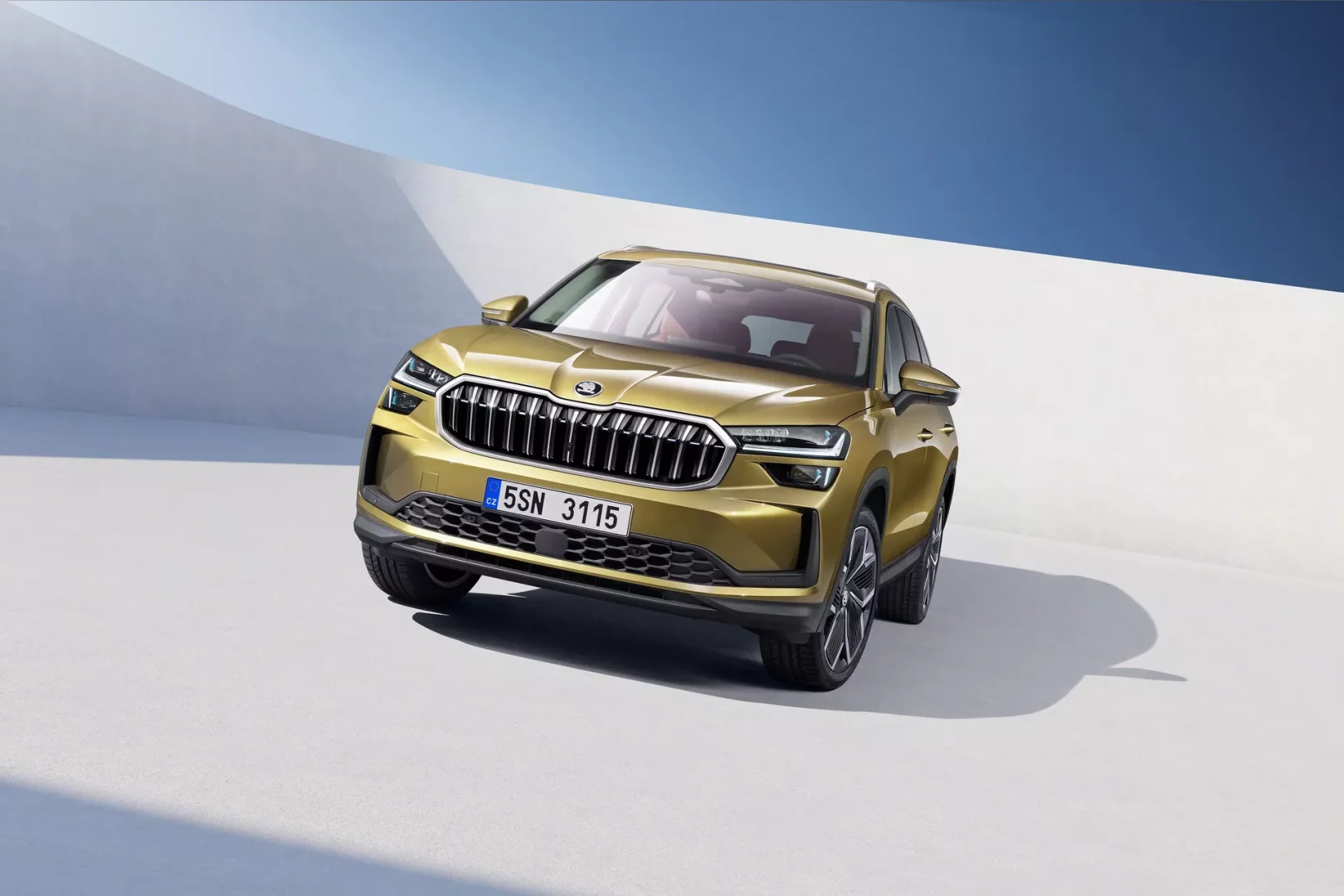 V ateliéru se rozsvěcují světla a před námi se objevuje nový Kodiaq. Ihned si všímáme nové přední šestihranné masky, které vévodí dvě hlavní věci. Nové logo Škodovky v tmavě chromovém odstínu a světelný pás mezi světlomety. Pod maskou pak nalézáme prostor pro přívod vzduchu a vylepšený přední nárazník.
