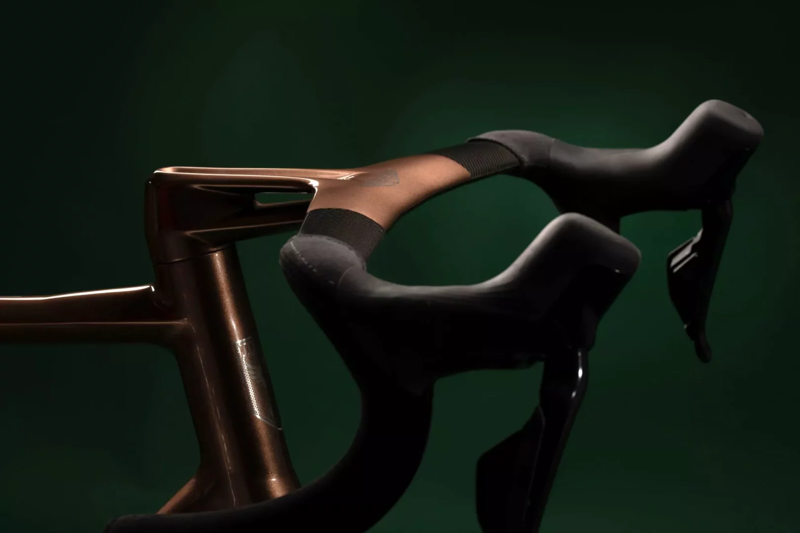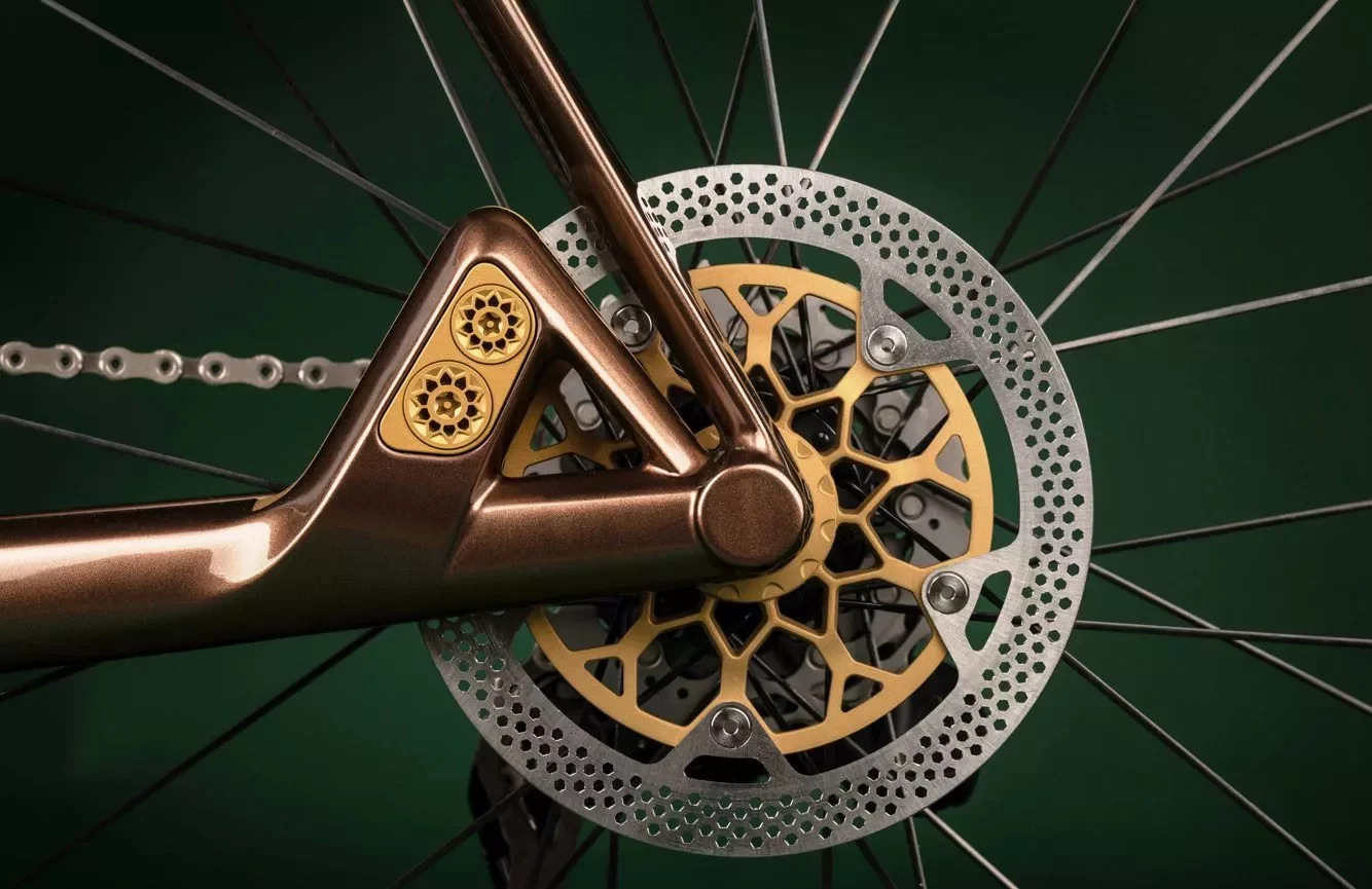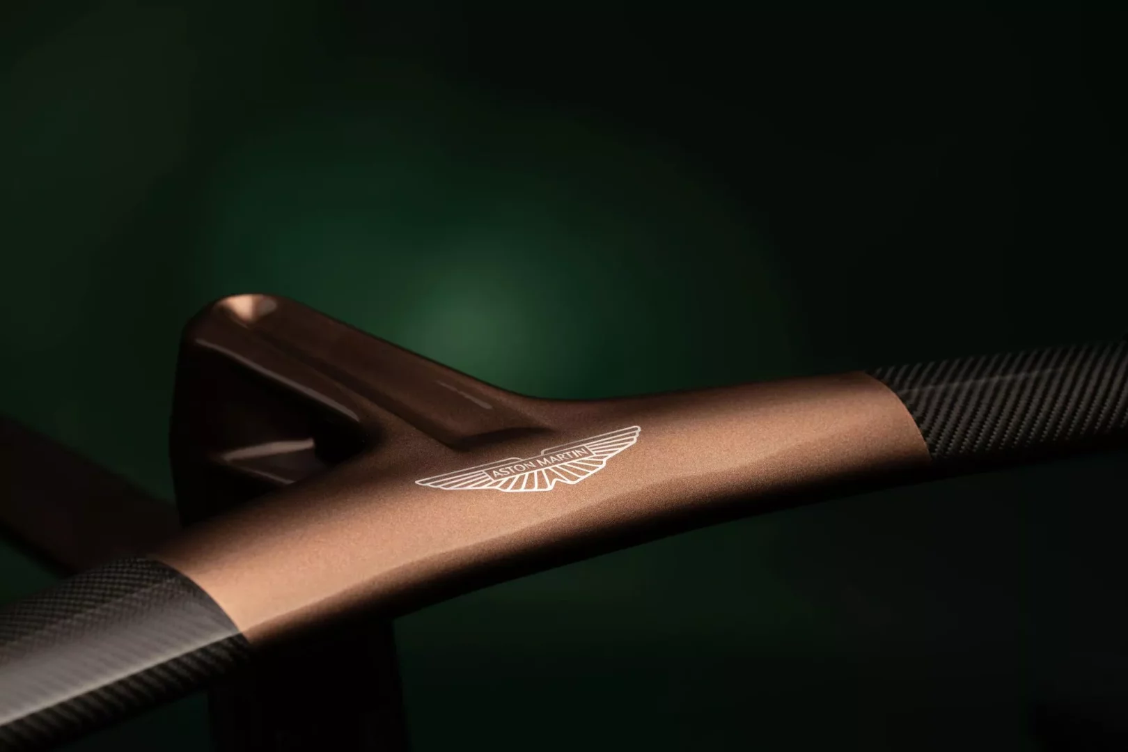 Už na první pohled je zřejmé, že se jedná o velmi výjimečný kousek – hledáte spojovací šrouby v rámu? Nenajdete. Prim tu totiž hraje ona estetická „aston-martinská“ čistota. Stejná inovativnost je použita i v samotné výrobě šasi, kde se využívá 3D tiskárna pro výrobu titanových spojovacích částí. Ty spojují jednotlivé trubky vyrobené z uhlíkových vláken. Rám tak má výjimečnou pevnost a kombinuje kvalitu odezvy kola a pohodlí jízdy.