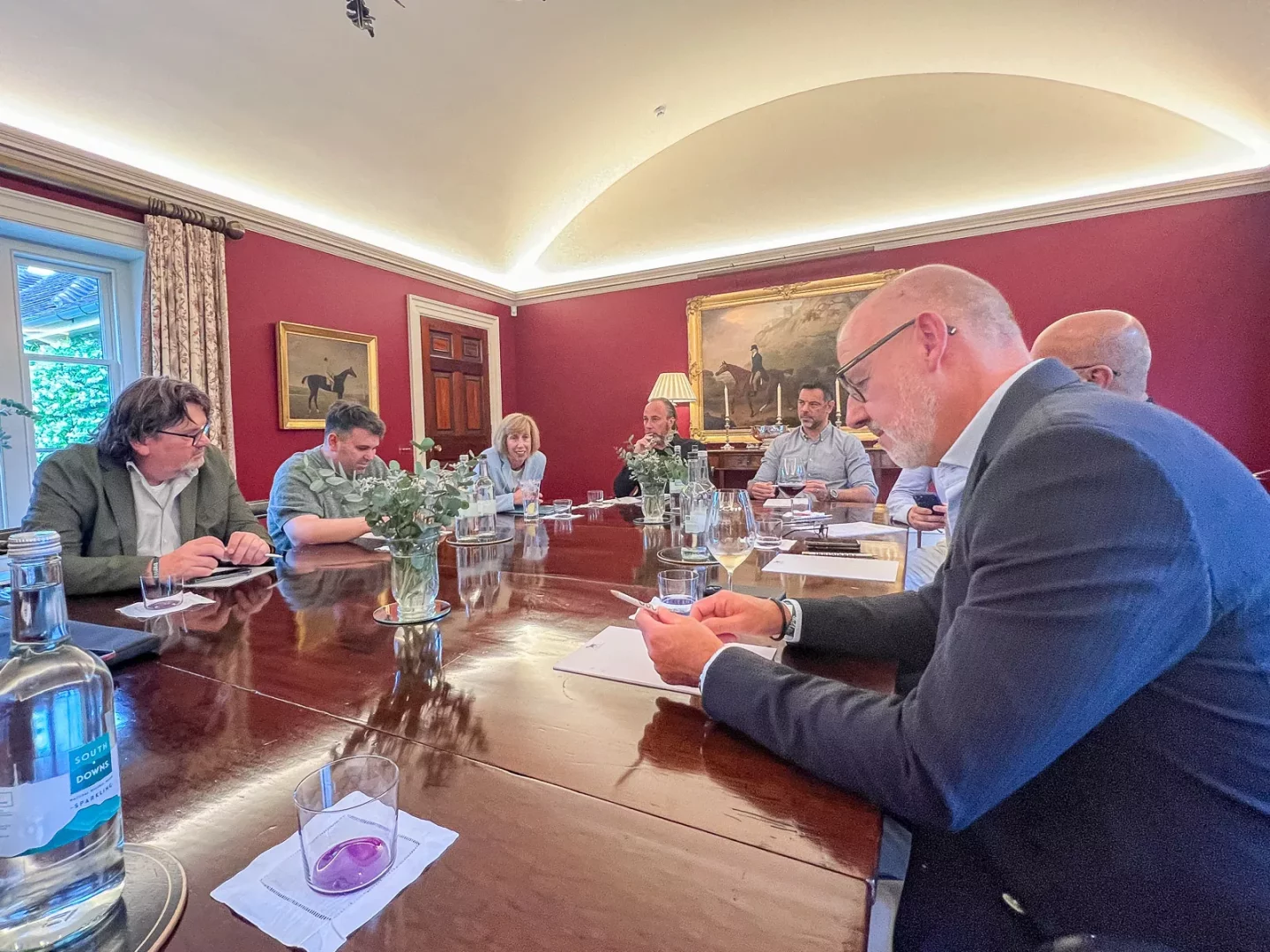 Začali jsme v osm, teď je asi pět odpoledne a program furt nekončí. Máme zhruba hodinku volno na sprchu a trochu relaxu, což se určitě hodí a zrovna tady v Hound Lodge to jde úplně samo, protože pokoje jsou fakt útulné, vybavené starým nábytkem, mají celkově moc příjemnou atmosféru a na každém pokoji je malá karafa se skotskou. Následuje setkání v hlavní místnosti, kde nám komorník doporučí na pití zdejší goodwoodské pivo a pak se čeká, až dorazí šéf Jaguaru Rawdon Glover. Má samozřejmě zpoždění, protože jede autem, na rozdíl od místní smetánky, která létá do Goodwoodu helikoptérami, přičemž sem během dne létá jeden vrtulník za druhým. Rawdon se tedy musí probojovat přes zácpu, stejně jako my. Nakonec dorazí a v jídelně u 130 let starého stolu si novináři mohou se šéfem popovídat formálně a během večeře pak i neformálně. Takže, jak to tedy se značkou Jaguar bude dál?