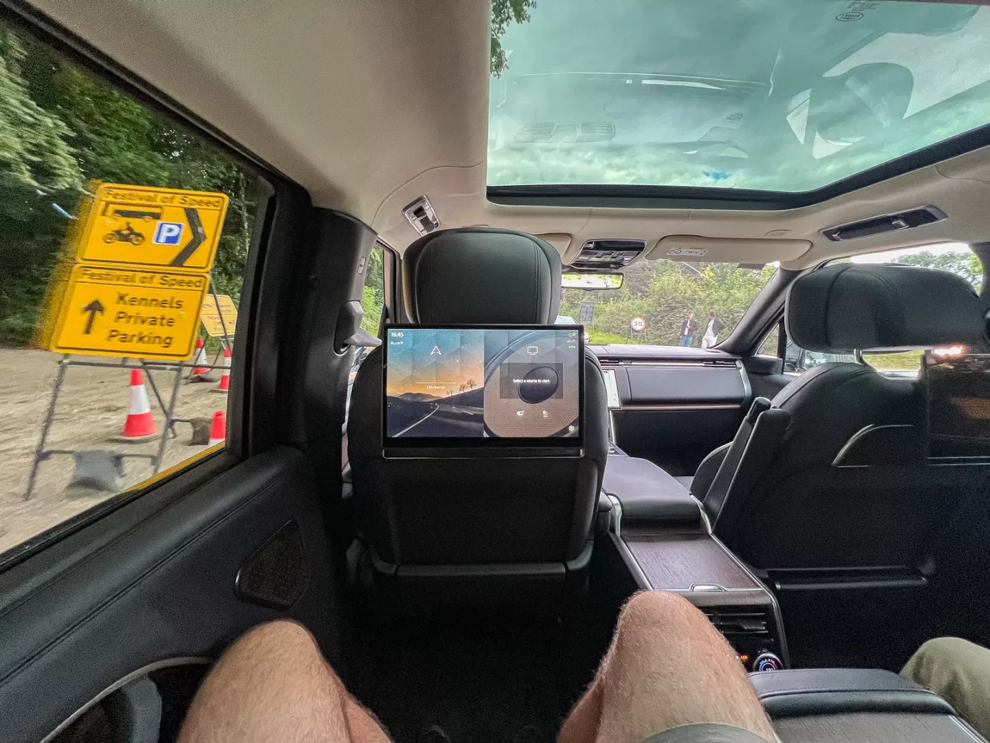 Přebírá si mne plnoštíhlí pán vysoký asi dva metry a odcházíme na parkoviště. Je trochu ve stresu, protože máme zpoždění oproti plánu. Na parkovišti na nás zabliká matně červený Range Rover SV a pán otevírá kupodivu dveře vpravo vzadu. Na svážení hostů dostal evropské novinářské auto s levostranným řízením. Ještě mne upozorní, že si mohu udělat absolutní pohodlí, protože tahle verze Range je ta nejluxusnější a na místě majitele je křeslo á-la business class. Člověk může tady zezadu odsunout sedadlo spolujezdce úplně vpřed, aby si natáhl nohy. Ale to dělat nechci, protože z vlastní zkušenosti vím, že řidiči pak sedadlo překáží ve výhledu a když řidič ještě sedí na špatné straně, než co si britský provoz žádá, přijde mi to jako neslušnost. S pánem každopádně hezky pokecáme. Byl to poctivý off-roaďák, který dříve pomáhal připravovat novinářské prezentace Land Roveru, tak jsme zavzpomínali na některé z nich. Dnes už je v důchodu a občas si vezme takovouto brigádu. Jinak doma v klidu opečovává tři svoje Defendery a jednu Škodu Kodiaq, protože prostě občas chce jezdit do Skotska a holt starý Defender trochu žere.