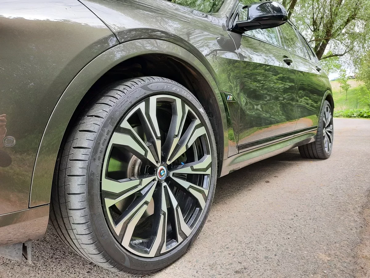 Pohledu ze strany dominují výrazné prolisy a hrají si do noty s příplatkovým zeleným metalickým lakem Manhattan (32 tis. Kč). A impozantní pohled doplňují 23palcová BMW kola se sportovními pneumatiky (a tady už si sáhnete hluboko do kapsy, protože si za vše umístěné v podbězích doplatíte 100 tis. Kč). A nesmím zapomenout, že i ona délka přes 5 metrů a 7místné vnitřní uspořádání, které je z toho patrné, dává na odiv, že v téhle „lodi“ bude pohodlně.