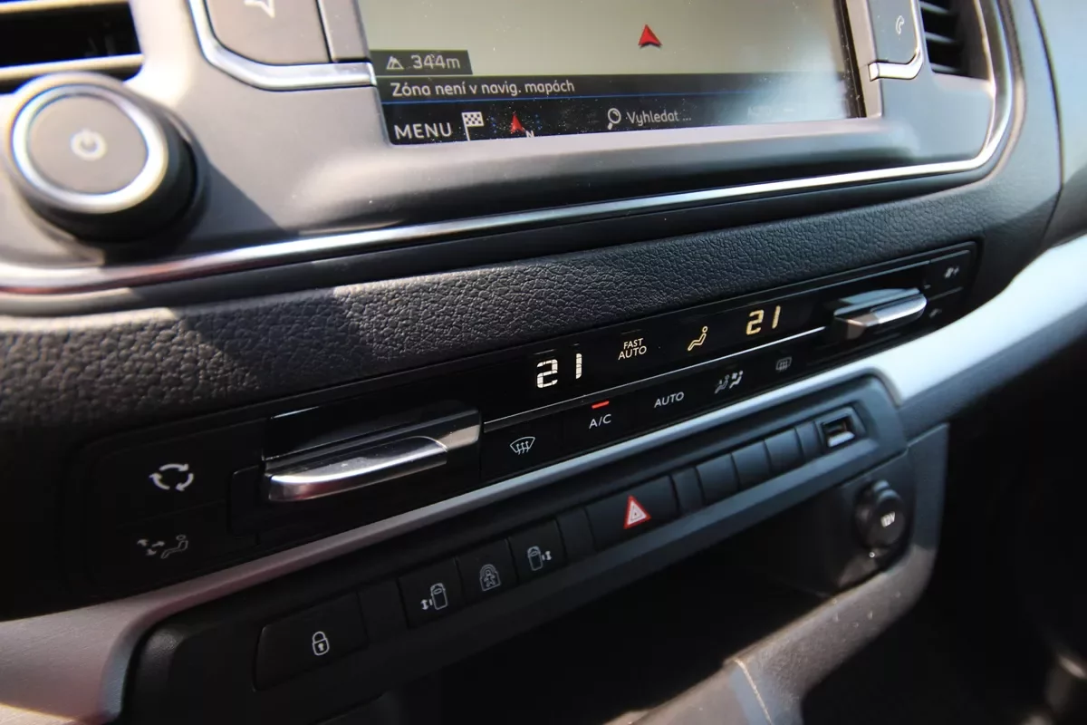 Jestli je na nových peugeotech něco skutečně k vzteku, potom jednoznačně čistě dotykové ovládání klimatizace. Naštěstí se to zlepšuje a každý nový model francouzské značky má klimatizaci vyvedenou trochu lépe než dřív. Traveller tím, že je v jádru dodávkou, u které se hodně hledí na ekonomiku výroby, dostal už od počátku do vínku fyzická tlačítka. Na nějaké módní dotykáče tu není příliš prostoru, a je to jedině dobře.